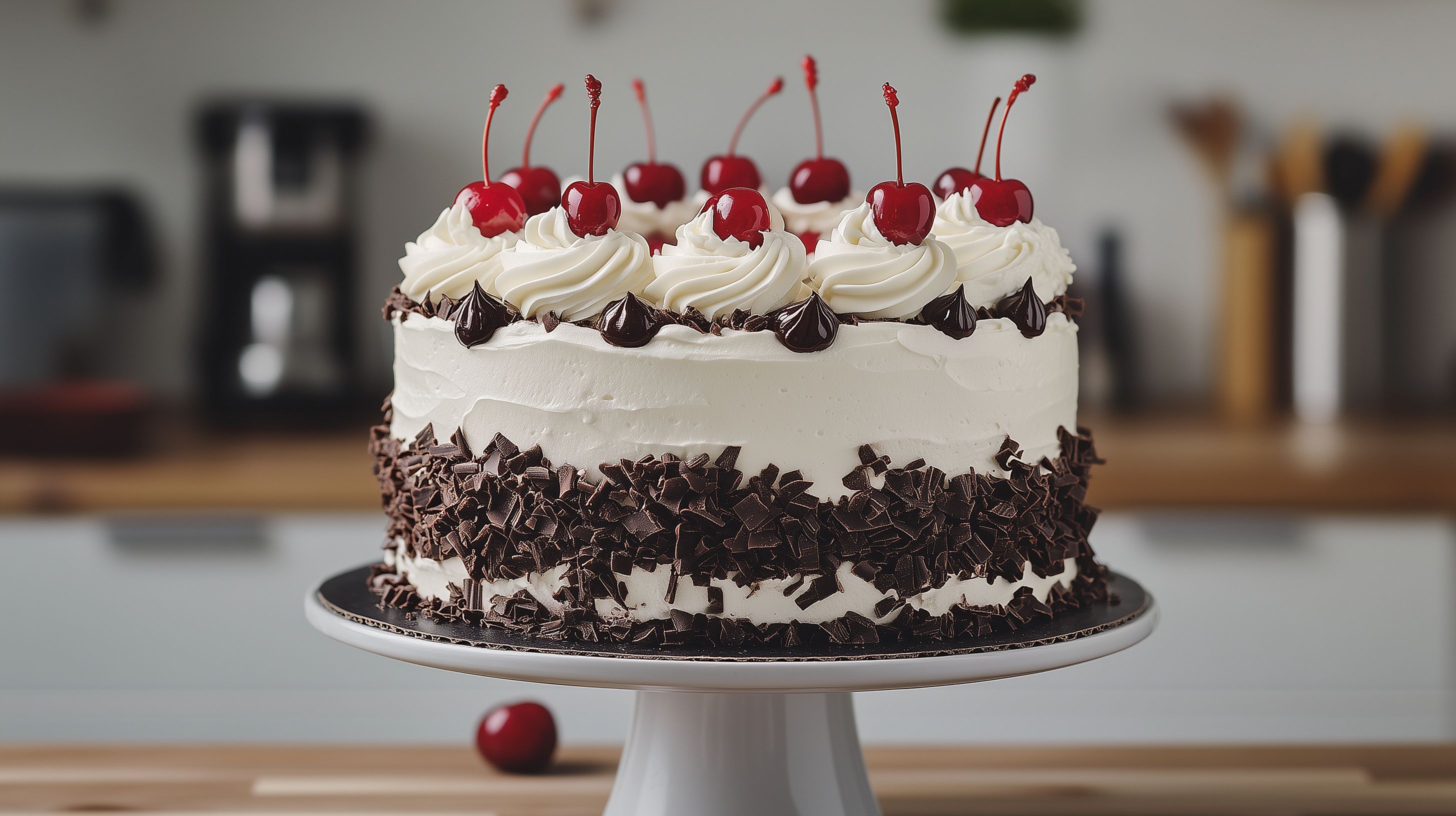 Dieses Bild zeigt eine dekorative Schwarzwälder Kirschtorte, die auf einem Kuchenständer platziert ist. Die Torte ist mit einer cremigen, weißen Oberfläche bedeckt und mit roten, glänzenden Kirschen sowie Schokoladenstückchen garniert. Die Torte steht auf einem Holztisch, was ihr einen rustikalen Charakter verleiht. Dieses hochauflösende Stockfoto eignet sich perfekt für Blogs, Newsletter, Social-Media-Beiträge oder Werbematerial rund um das Thema Backen, Süßspeisen und kulinarischen Genuss. Es ist unter einer Creative-Commons-Lizenz verfügbar und kann kostenfrei für kommerzielle und nicht-kommerzielle Zwecke genutzt werden.