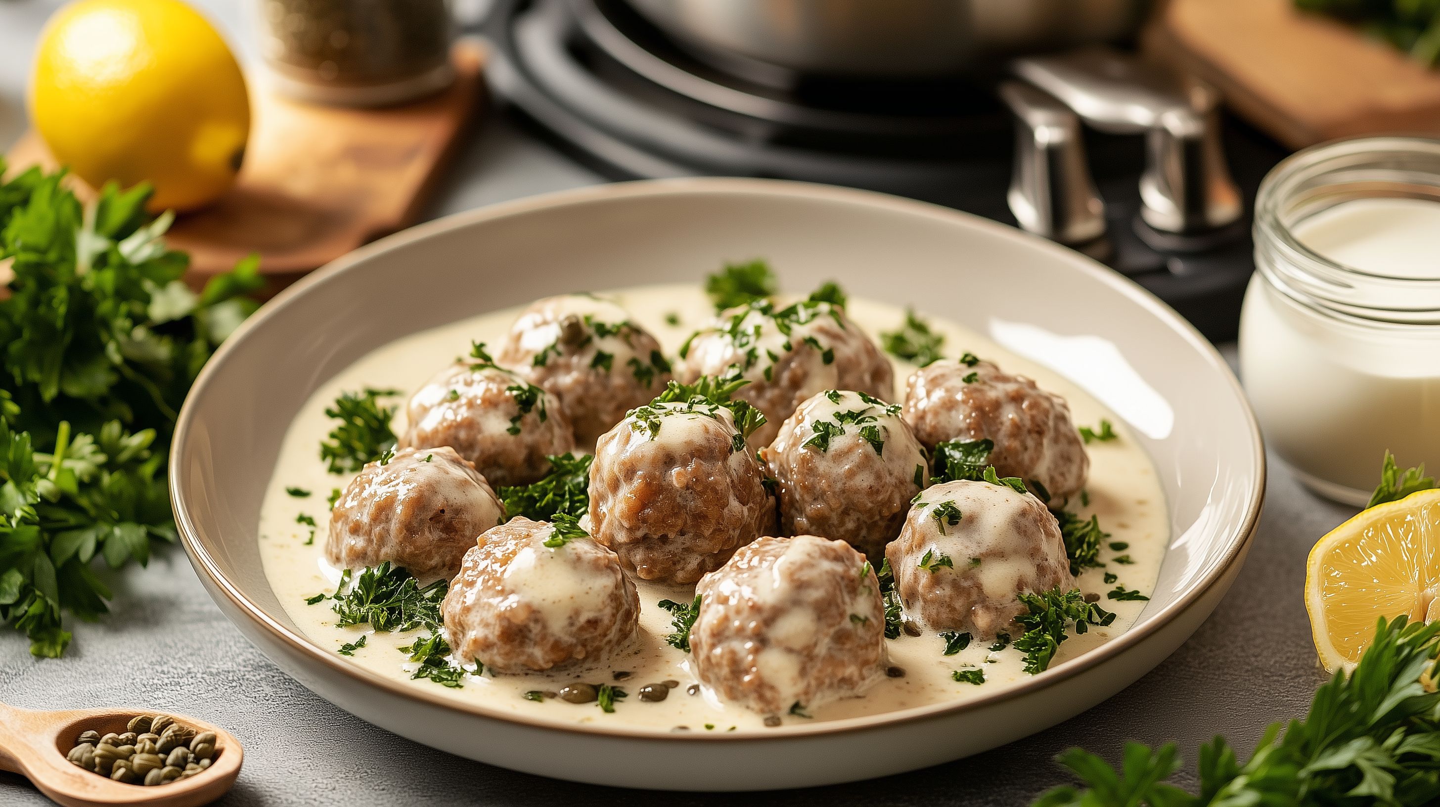 Dieses Foto zeigt eine Platte voller köstlicher Kalbfleischbällchen in einer cremigen Sahnesoße, dekorativ angerichtet auf einem vintage-inspirierten Teller. Die Bällchen sind mit frischer Petersilie garniert, was dem Gericht eine appetitliche Frische verleiht. Die Farbkontraste zwischen dem goldbraunen Fleisch, der weißen Sauce und den grünen Kräutern ergeben eine einladende, appetitanregende Optik. Dieses Stockfoto eignet sich hervorragend für Rezeptsammlungen, Kochblogs, Social-Media-Beiträge rund um das Thema Kochen und Kulinarik sowie als hochwertiges Werbefoto für Restaurants oder Catering-Anbieter. Es ist in hoher Auflösung und unter einer Creative-Commons-Lizenz verfügbar.