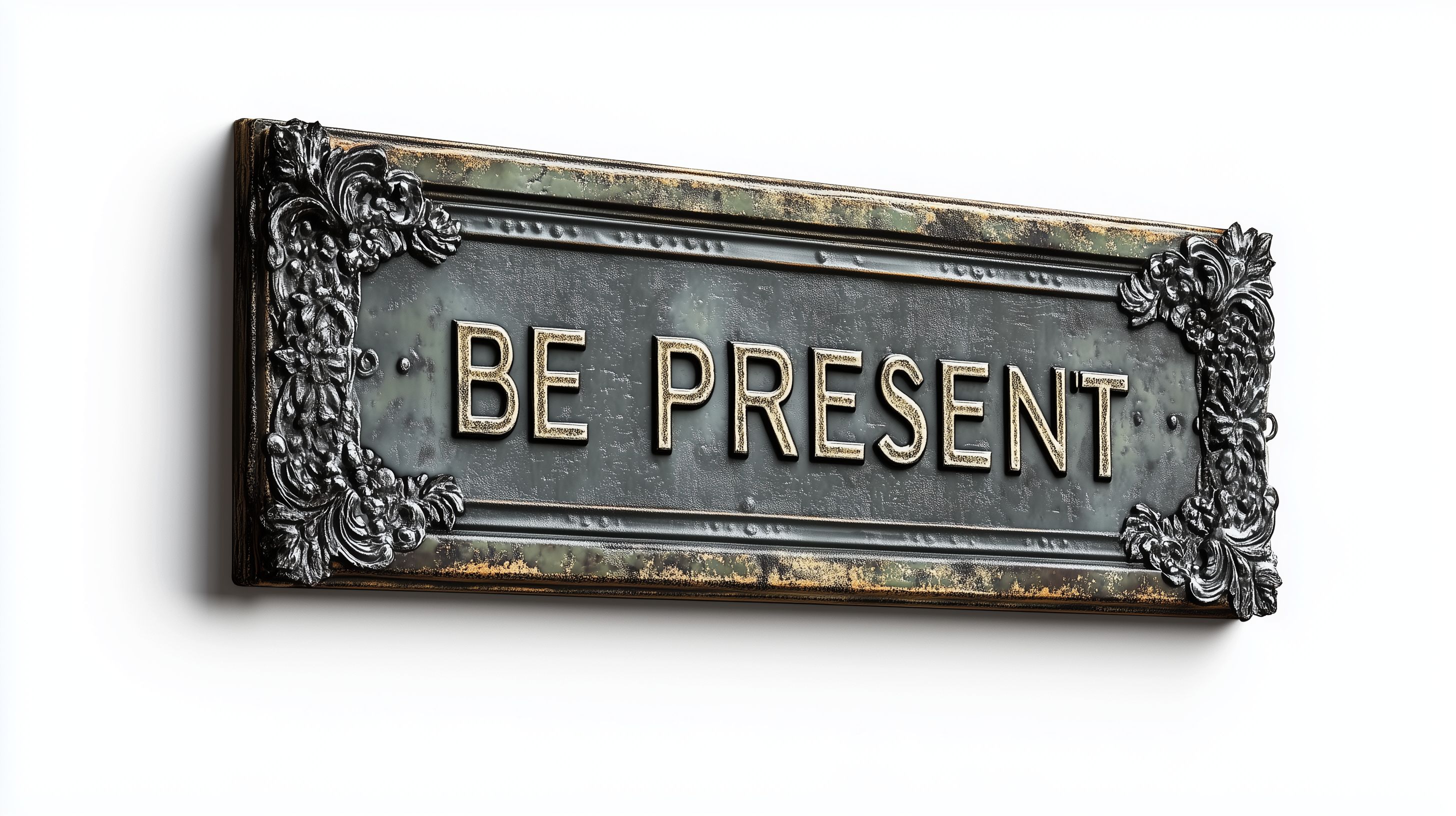 Dieses Foto zeigt ein rustikales Metallschild mit einer antik wirkenden Verzierung. Die Beschriftung 'BE PRESENT' ist in großen, goldenen Lettern darauf zu lesen. Das Schild hat einen vintage-inspirierten, klassischen Look und Charme. Es könnte perfekt als Wanddekoration in einem Zuhause, Büro oder Geschäft eingesetzt werden, um Achtsamkeit und Gegenwärtigkeit zu fördern.