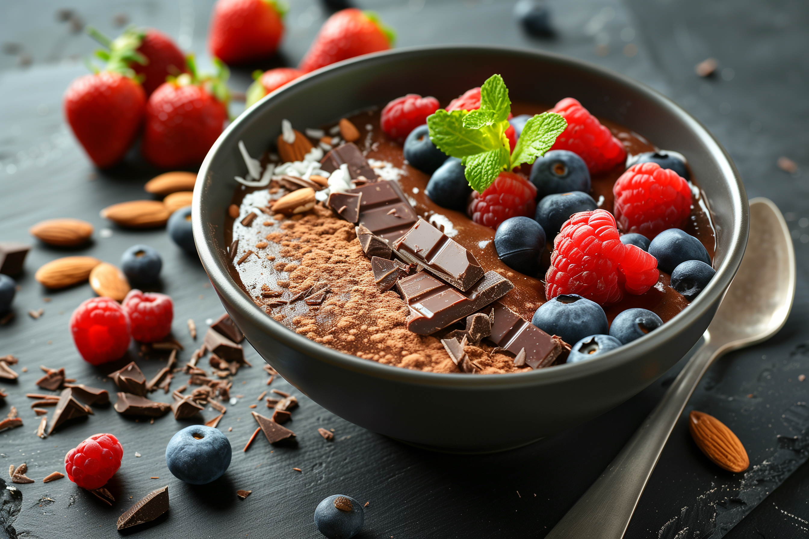 Dieses köstliche Schoko-Früchte-Dessert ist ein wahrer Genuss für die Sinne. Die dunkle Schokolade kontrastiert herrlich mit den frischen, saftigen Beeren und Früchten, während die Mandeln und Minze einen erfrischenden Akzent setzen. Das Foto zeigt die Nahaufnahme eines perfekt arrangierten Desserts in einem dunklen Schale, umgeben von zusätzlichen Zutaten. Dieses Bild eignet sich hervorragend für Blogs, Newsletter, Social-Media-Beiträge und Werbeanzeigen rund um Rezepte, gesunde Ernährung und Kulinarik. Als hochwertiges, kostenloses Stockfoto unter Creative-Commons-Lizenz lässt es sich vielfältig einsetzen.