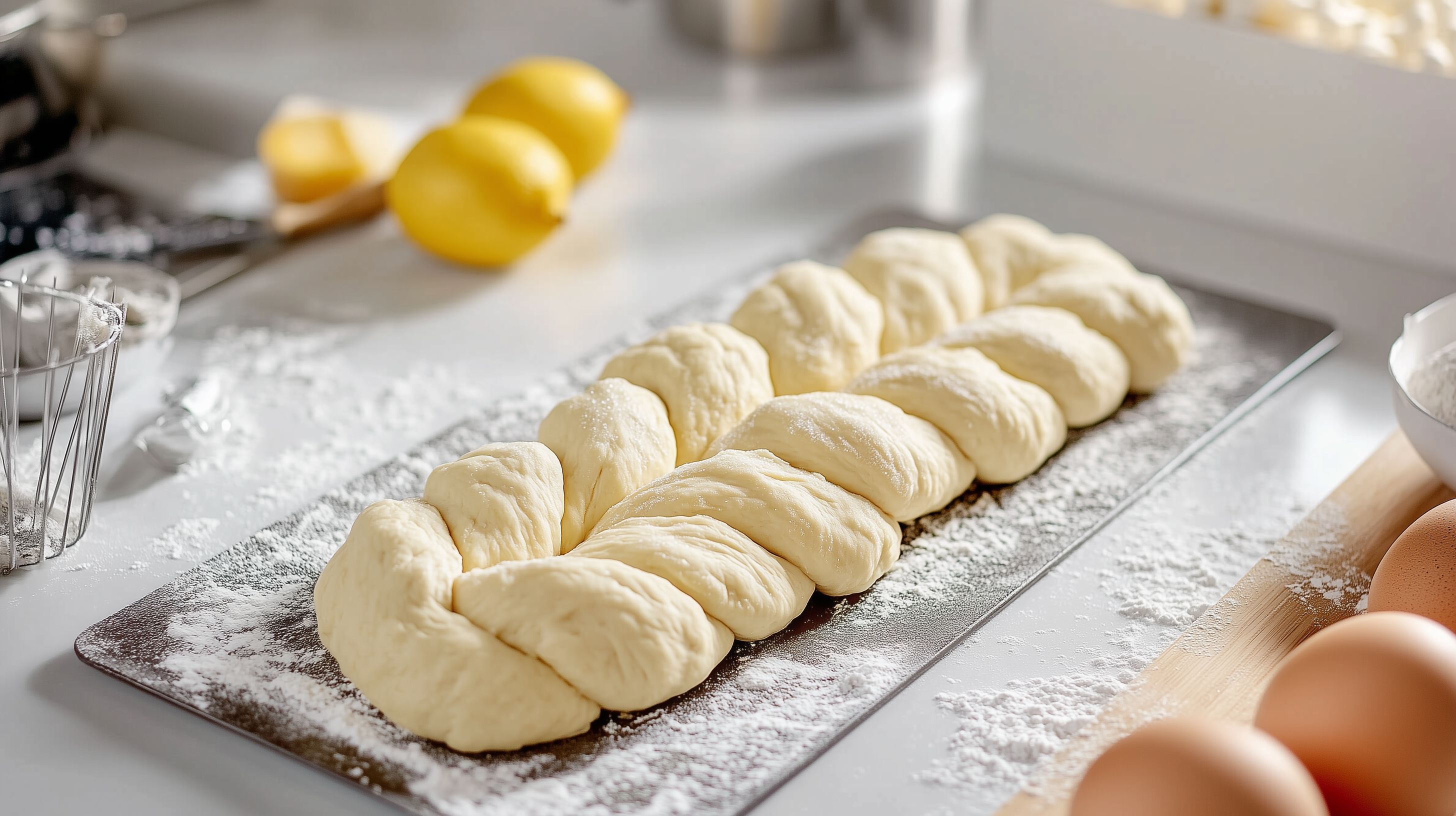 Das Foto zeigt einen frisch gebackenen Hefezopf, der auf einer mehlbepuderten Arbeitsfläche liegt. Der Teig ist goldgelb und weich, er wurde offensichtlich liebevoll von Hand geformt. Neben dem Zopf befinden sich einige Zitronen, die möglicherweise für das Rezept verwendet wurden. Der Hintergrund ist schlicht gehalten, sodass der Hefezopf in all seiner Pracht im Mittelpunkt steht. Dieses Bild wäre perfekt für einen Beitrag in einem Food-Blog, einem Newsletter mit Backrezepten oder für die Werbung eines Bäckereigeschäfts. Als hochauflösendes, kostenloses Stockfoto unter Creative-Commons-Lizenz lässt es sich vielseitig einsetzen.