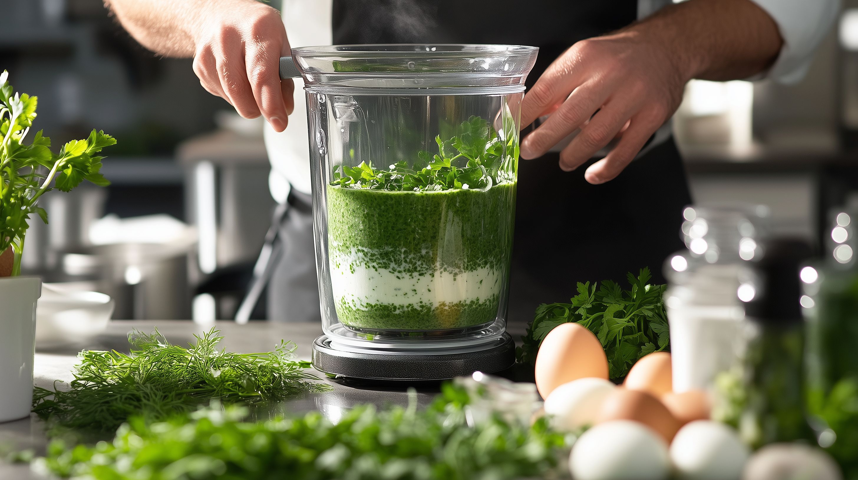 Dieses Foto zeigt einen Küchenraum mit modernem Design und frischen Kräutern auf einer Arbeitsplatte. Der Fokus liegt auf einem Glasmixer, in dem eine grüne, cremige Mischung aus Kräutern und Milchprodukten angerührt wird. Das Bild vermittelt ein Gefühl von Gesundheit, Frische und Natürlichkeit, passend für den Einsatz in Rezepten, Lifestyle-Artikeln oder als Hintergrund für Social-Media-Posts zum Thema Ernährung und nachhaltiger Lebensstil. Als hochwertiges, kostenloses Stockfoto unter einer Creative-Commons-Lizenz eignet es sich ideal für vielfältige redaktionelle und werbliche Zwecke.