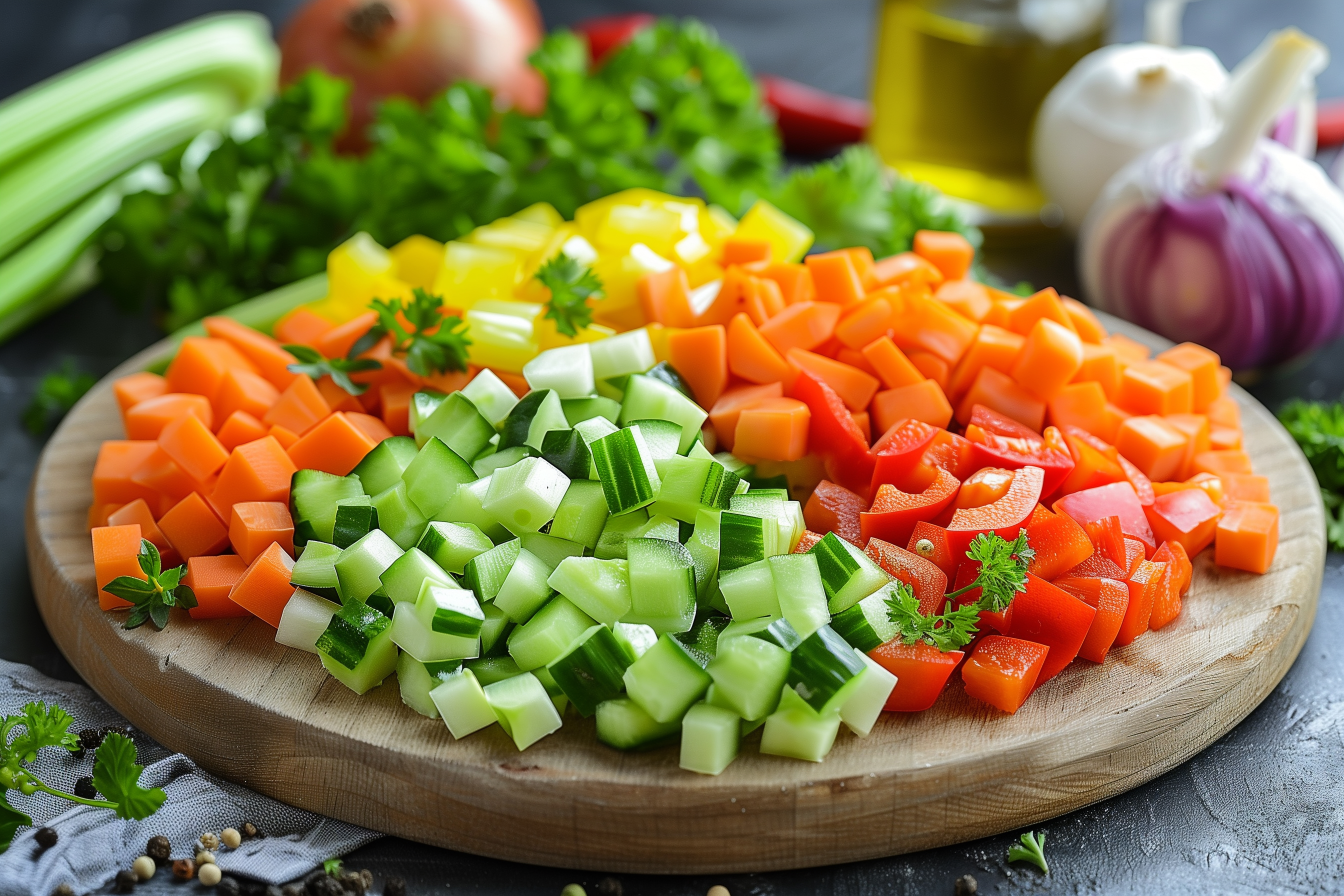 Das Bild zeigt eine Draufsicht auf ein Holzbrett mit verschiedenen Gemüsestücken. Es ist eine bunte Zusammenstellung von geschnittenem Paprika, Karotten, Gurken, Zwiebeln und Kräutern. Die Zutaten sind frisch und sehen appetitlich aus. Sie könnten für ein gesundes Gericht, einen Salat oder eine Gemüsepfanne verwendet werden. Das Foto eignet sich gut für Blogs, Newsletter, Social-Media-Posts oder Werbematerial rund um Ernährung, Kochen oder gesunde Lebensmittel. Es ist ein hochwertiges, kostenloses Stockfoto unter Creative-Commons-Lizenz, das in hoher Auflösung zur Verfügung steht.