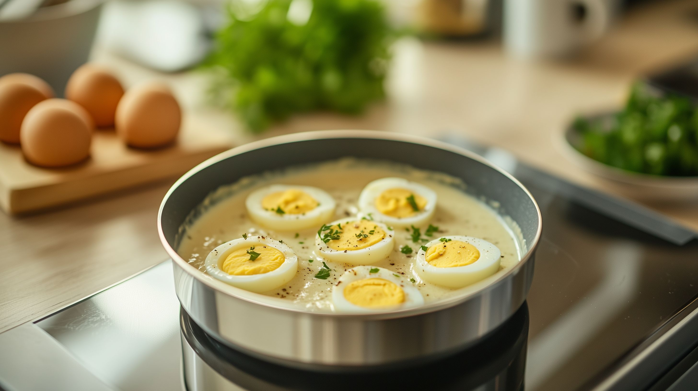 Dieses hochwertige Stockfoto zeigt eine Schüssel mit köstlichen Eiern in leckerer Senfsoße, die auf einem Induktionsherd zubereitet werden. Das natürliche Licht und die rustikale Anordnung der Zutaten verleihen dem Bild einen appetitlichen Landhaus-Stil. Diese Aufnahme eignet sich hervorragend für Rezepte, Kochblogs, Lebensmittelwerbung oder Artikel zu gesunder Ernährung. Das kostenfrei verfügbare Foto ist in hoher Auflösung verfügbar und unter einer Creative-Commons-Lizenz nutzbar.