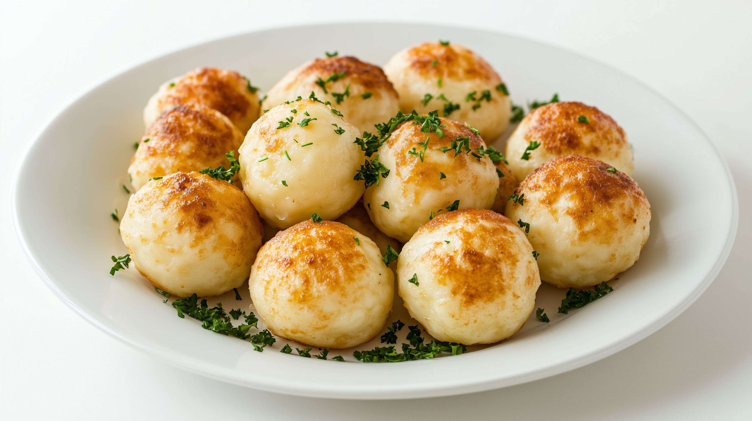 Dieses appetitliche Foto zeigt eine Portion frisch zubereiteter Knödel, die auf einem weißen Teller angerichtet sind. Die goldbraun gebackenen Knödel sind mit frisch gehackter Petersilie garniert, was ihnen eine schöne Optik verleiht. Knödel sind ein traditionelles Gericht aus Kartoffeln oder Brot, das typisch für die bayerische und österreichische Küche ist. Sie eignen sich hervorragend als leckere Beilage oder als eigenständiges Hauptgericht. Dieses hochwertige Stockfoto in hoher Auflösung ist ideal für den Einsatz in Blogs, Websites, Newslettern oder Werbematerialien rund um das Thema Kochen, Essen und Ernährung. Es steht unter einer Creative Commons-Lizenz zur kostenlosen Verwendung zur Verfügung.