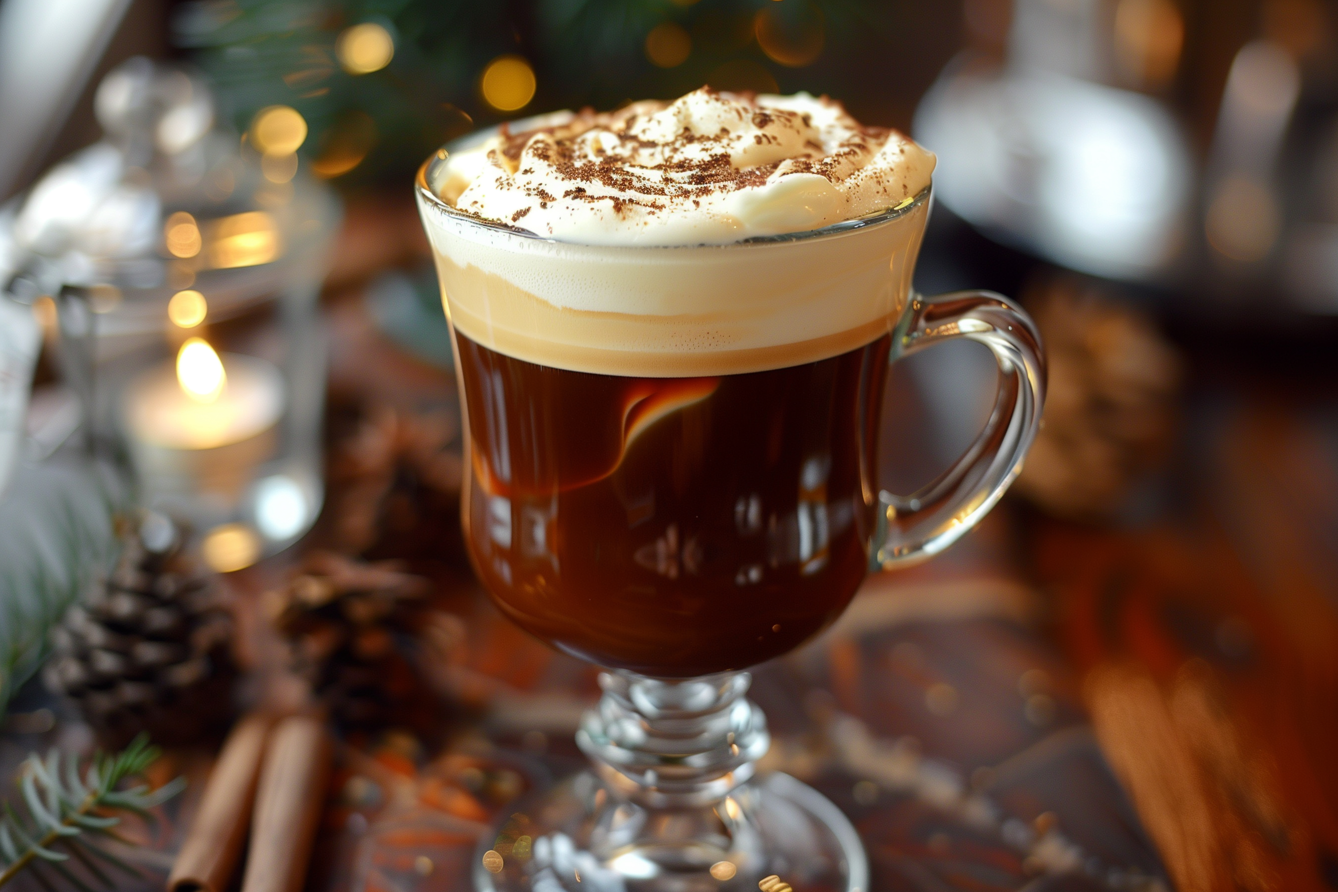 Das Bild zeigt ein winterliches, weihnachtliches Getränk in einer Glastasse. Die Tasse ist gefüllt mit einer dunkelbraunen, kaffeeähnlichen Flüssigkeit, die mit einer cremigen Sahnehaube bedeckt ist und mit Kakaopulver bestäubt ist. Die Tasse steht auf einem rustikalen, hölzernen Untergrund, der von Tannenzweigen, Zapfen und Kerzen umgeben ist. Der Hintergrund ist leicht unscharf, aber es sind Lichtpunkte und eine warme, gemütliche Atmosphäre zu erkennen.