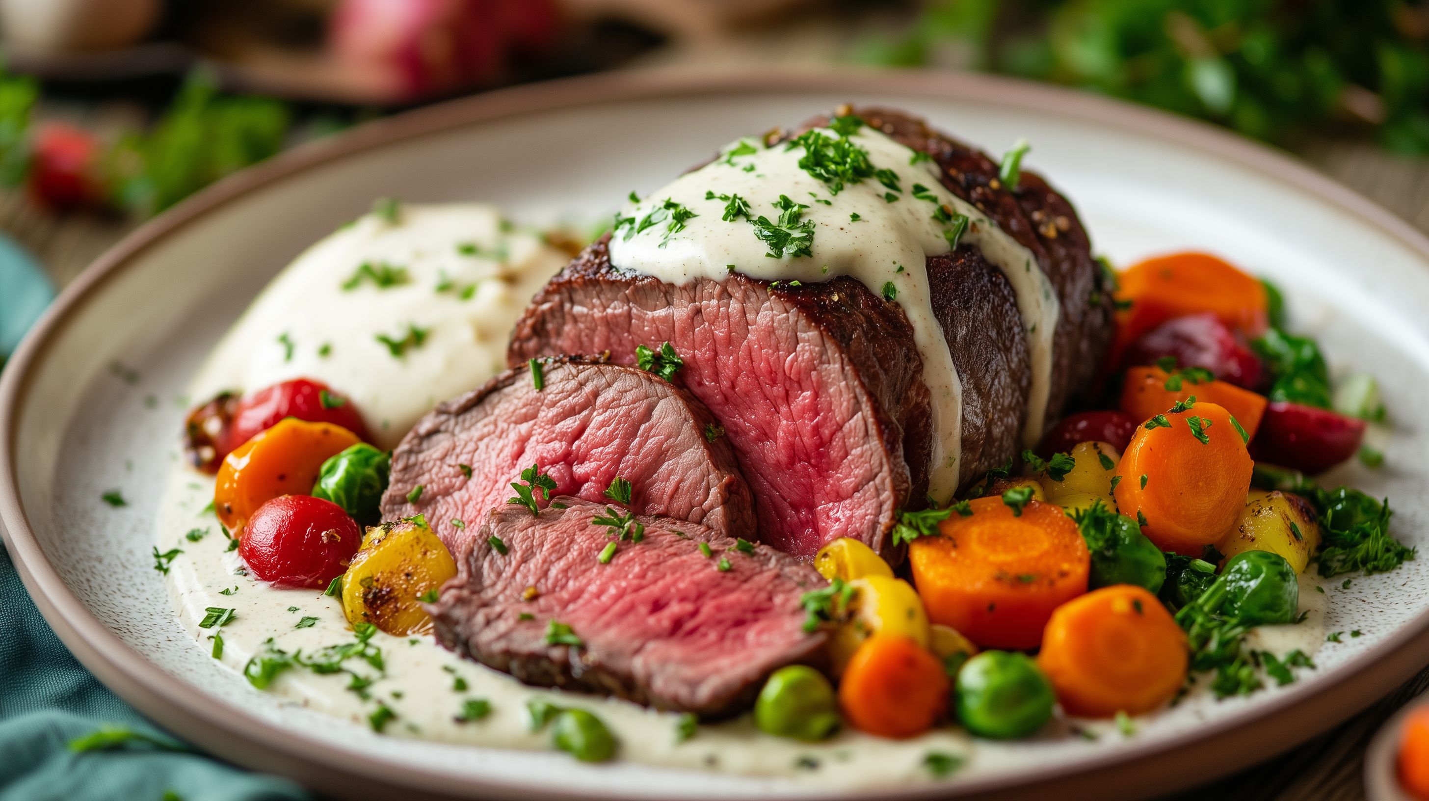Dieses Foto zeigt ein schmackhaftes Rinderfilet, das auf einem rustikalen Teller angerichtet ist. Das Fleisch ist rosa-rot gegart und mit einer cremigen Sauce bedeckt. Umgeben ist es von buntem, frisch zubereitetem Gemüse wie Karotten, Brokkoli und Kirschtomaten. Der Teller steht auf einer grünen Tischdecke, was dem Gericht eine natürliche und appetitliche Präsentation verleiht. Dieses Foto eignet sich hervorragend für den Einsatz in Rezeptbüchern, Gastroblogs, Lebensmittel-Websites oder Werbekampagnen für hochwertige Lebensmittel und gehobene Küche. Als kostenloses Stockfoto in hoher Auflösung und unter Creative-Commons-Lizenz ist es vielseitig einsetzbar.
