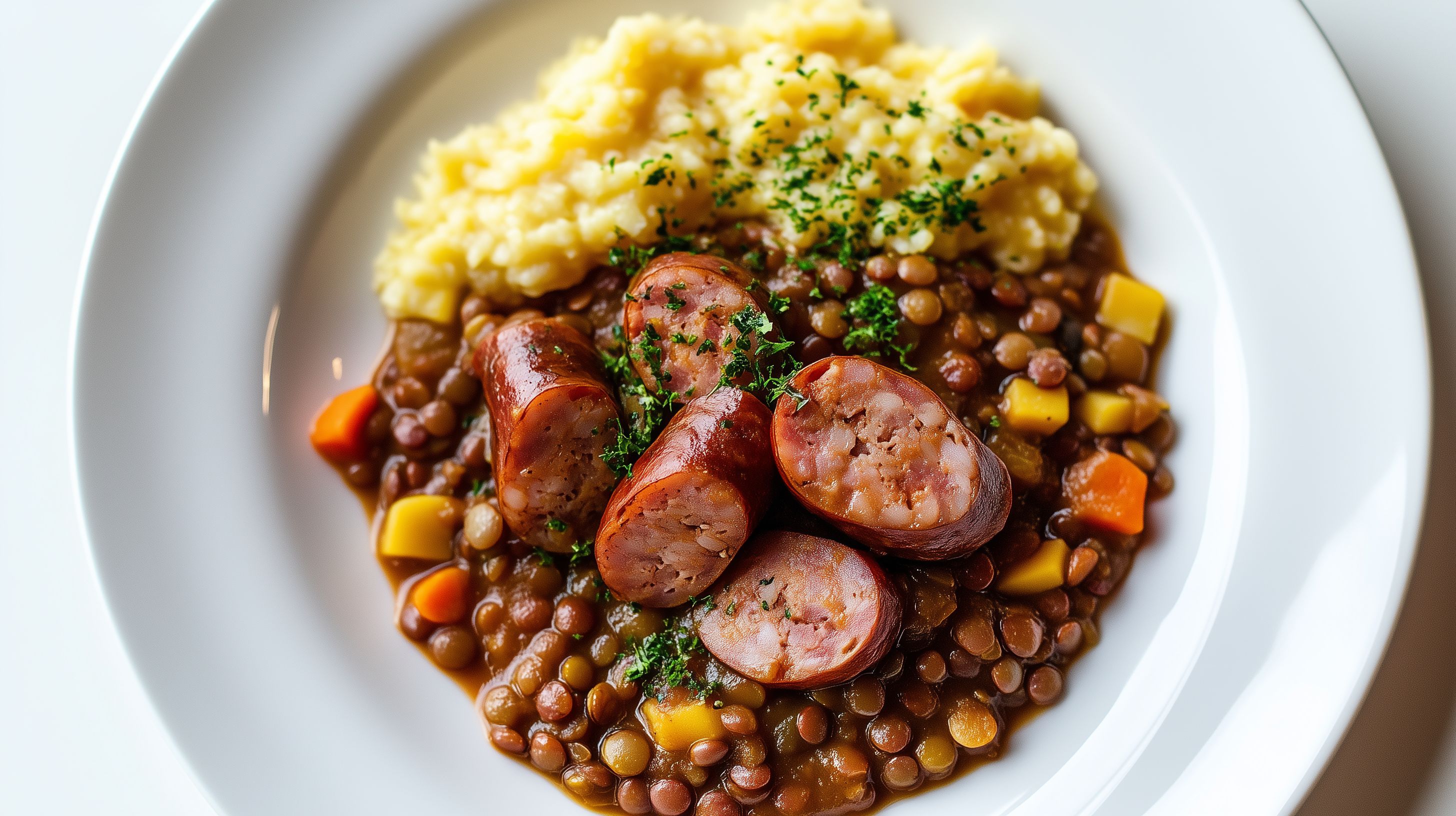 Dieses Foto zeigt einen köstlichen Linseneintopf mit knackigen Würstchen und cremigem Kartoffelpüree auf einem weißen Teller. Das traditionelle Gericht ist perfekt für kalte Herbst- und Wintertage und bietet mit seiner nährstoffreichen Zubereitung eine sättigende und gesunde Mahlzeit. Das Foto eignet sich hervorragend für den Einsatz in Rezeptblogs, Kochbüchern oder Werbekampagnen für Lebensmittelmarken. Als kostenloses Stockfoto in hoher Auflösung und unter Creative-Commons-Lizenz verfügbar, ist es flexibel einsetzbar.