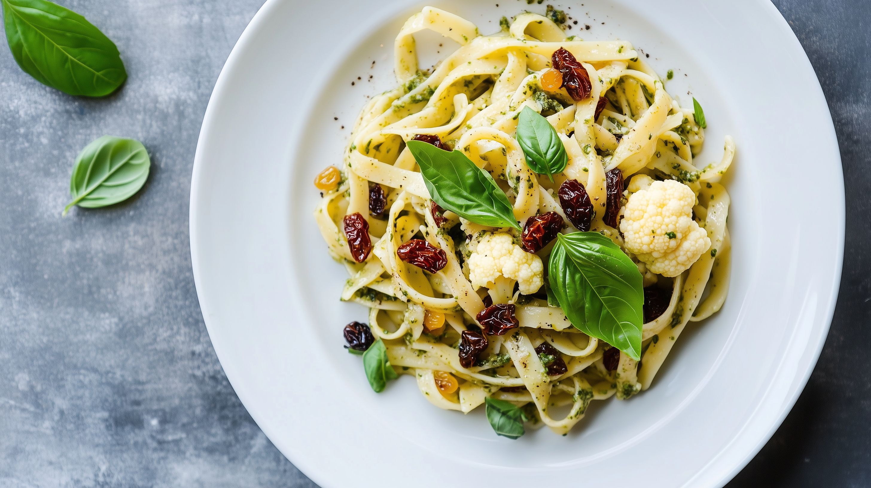Dieses Foto zeigt eine appetitlich angerichtete Portion Pasta mit Blumenkohl und getrockneten Tomaten. Die Tagliatelle sind mit einem cremigen Pesto-artigen Sauce überzogen, garniert mit frischen Basilikumblättern und vereinzelten Blumenkohlröschen. Die roten getrockneten Tomaten sorgen für einen tollen farblichen Akzent und ergänzen den Geschmack des Gerichts. Das Bild strahlt eine rustikale, mediterrane Atmosphäre aus und eignet sich perfekt als kostenloses Stockfoto für Rezept-Blogs, Kochportale oder Werbekampagnen rund um italienische Küche, gesunde Ernährung und kulinarische Genüsse. Die hochauflösende, frei nutzbare Aufnahme ist unter Creative-Commons-Lizenz verfügbar.