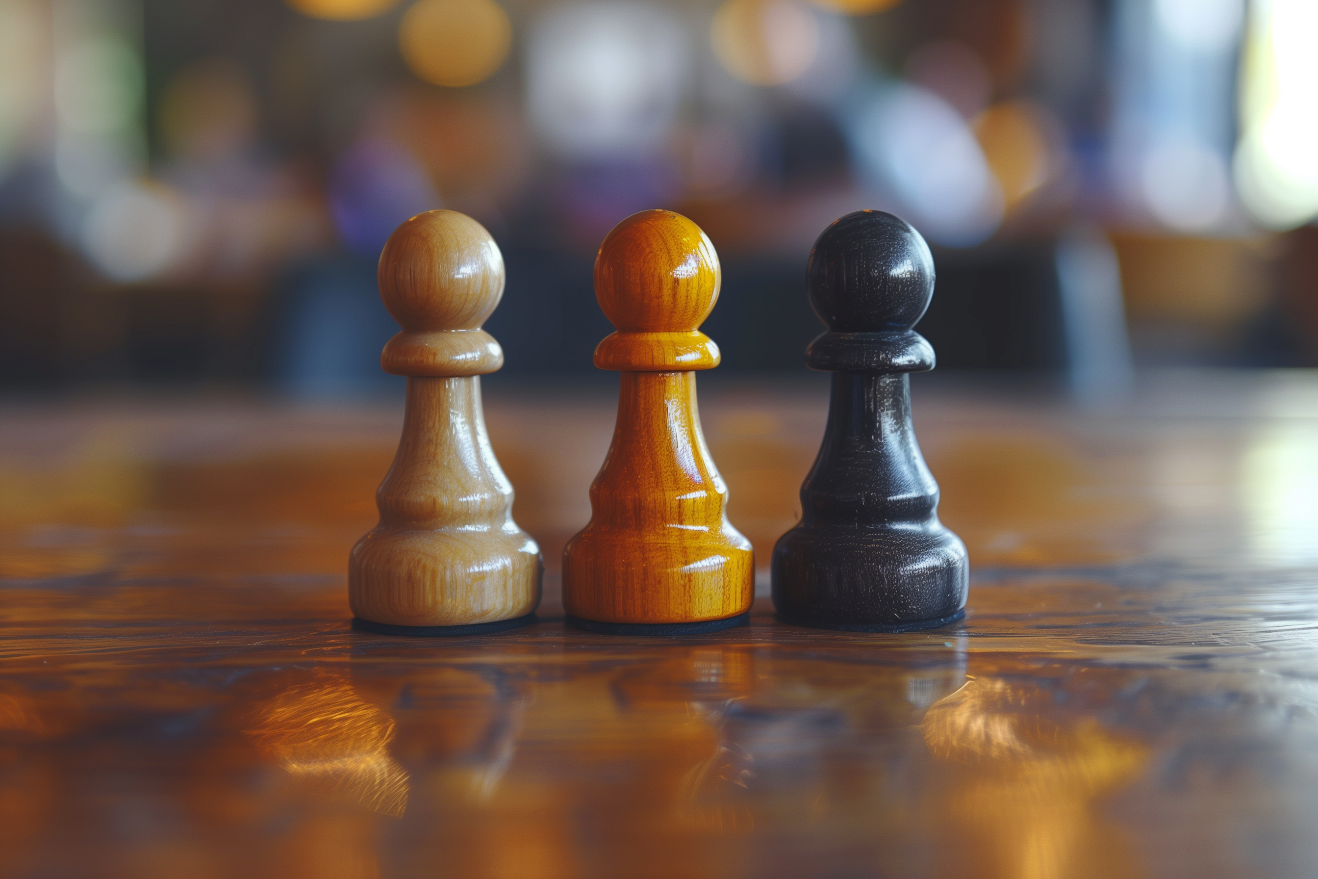 Das Bild zeigt drei Schachfiguren - einen hellen Bauern, einen orangen Bauern und einen schwarzen Bauern - die auf einer dunklen, glänzenden Holzoberfläche stehen. Die Figuren werfen scharfe Schatten, die sich auf der Oberfläche reflektieren, was dem Bild eine abstrakte und konzeptionelle Ästhetik verleiht.