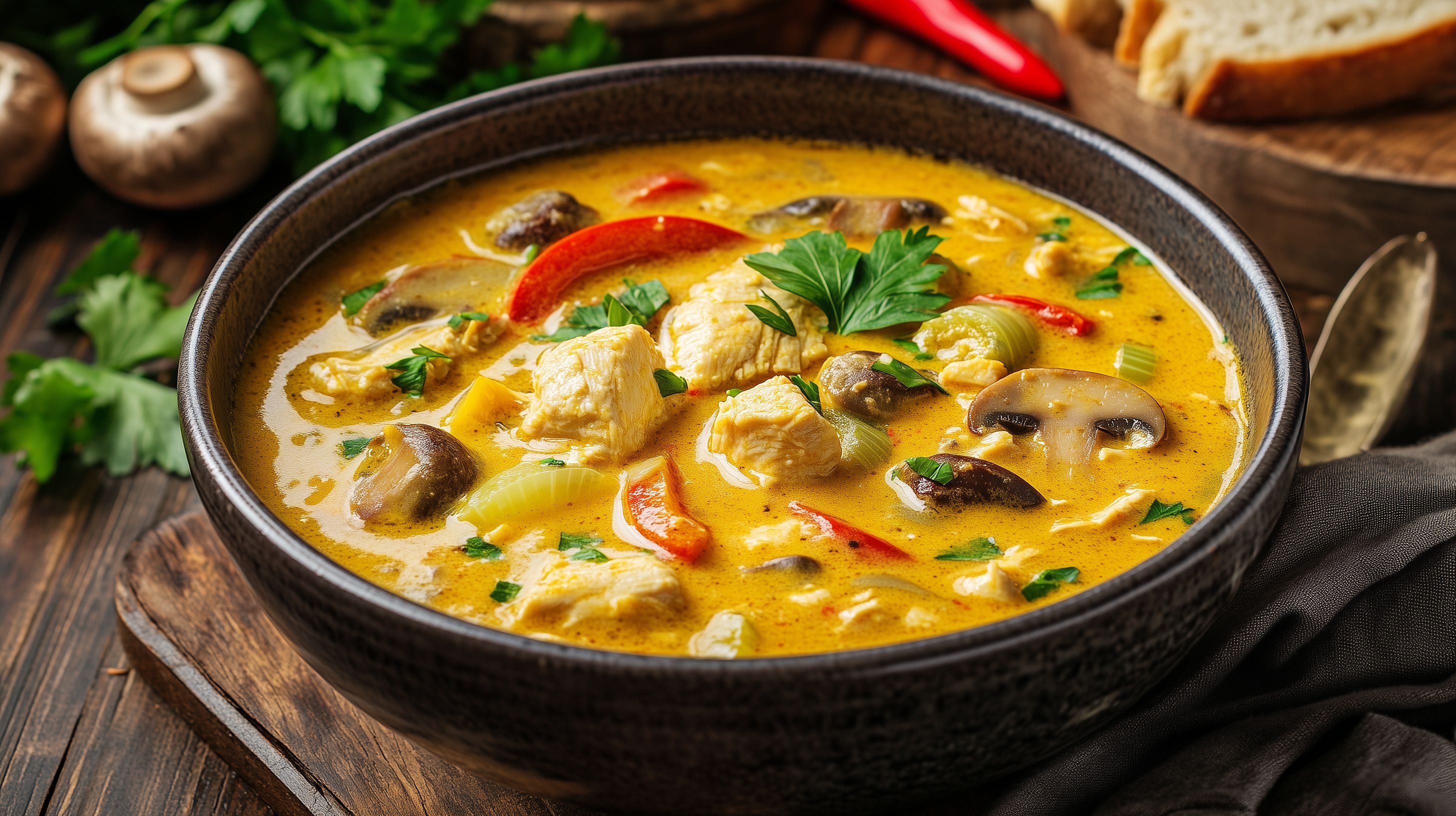 Dieses Foto zeigt eine leckere und nahrhaft aussehende Hühnersuppe in einer großen, rustikalen Schüssel. Die Suppe ist cremig und mit buntem Gemüse wie Paprika und Pilzen gefüllt, garniert mit frisch gehackter Petersilie. Im Hintergrund sind weitere Zutaten wie Brot und Gewürze zu sehen, die den Eindruck eines hausgemachten, kräftigen Gerichts vermitteln. Dieses Stockfoto eignet sich hervorragend für Blogs, Newsletter oder Social-Media-Beiträge rund um Rezepte, Kochen und gesunde Ernährung. Die hohe Auflösung und Creative-Commons-Lizenz ermöglichen eine einfache und rechtssichere Verwendung.