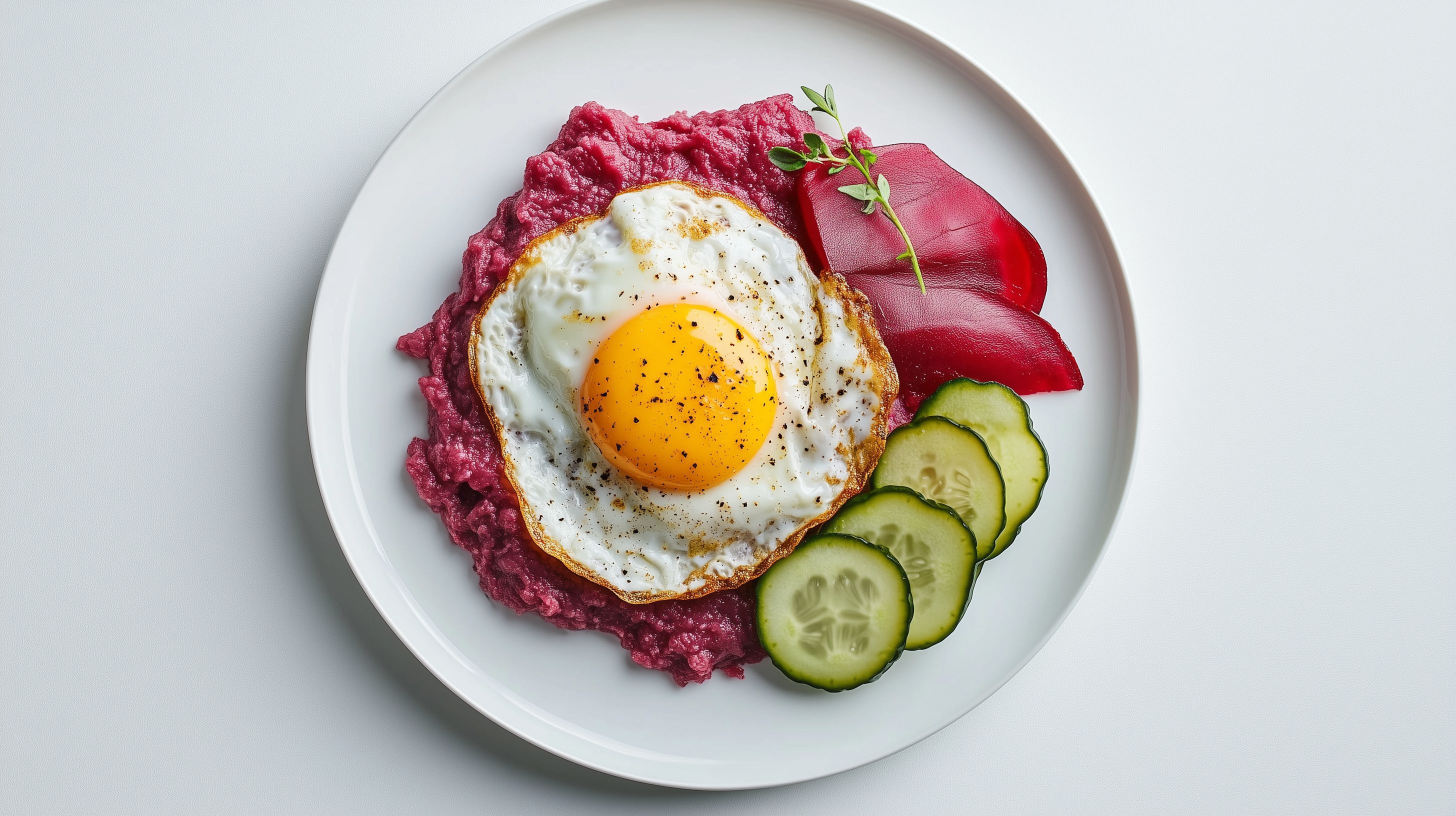 Das Bild zeigt eine appetitliche Komposition aus Labskaus, einem traditionellen Gericht der norddeutschen Küche, in Form eines Beet-Wurzelpürees. Darauf liegt ein frisch zubereitetes Spiegelei mit kräftig gelbem Dotter. Umrahmt wird das Ganze von frischen Gurkenscheiben und roten Paprikastücken, die dem Teller einen farbenfrohen, gesunden Akzent verleihen. Die Präsentation auf einem weißen Teller unterstreicht den minimalistischen, natürlichen Charakter des Gerichts. Dieses Stockfoto eignet sich hervorragend für Beiträge in Foodblogs, Newsletter zum Thema gesunde Ernährung oder Social-Media-Posts rund um das Frühstücks- und Brunchthema. Die hohe Auflösung und die Creative-Commons-Lizenz ermöglichen eine vielseitige Nutzung des Fotos.