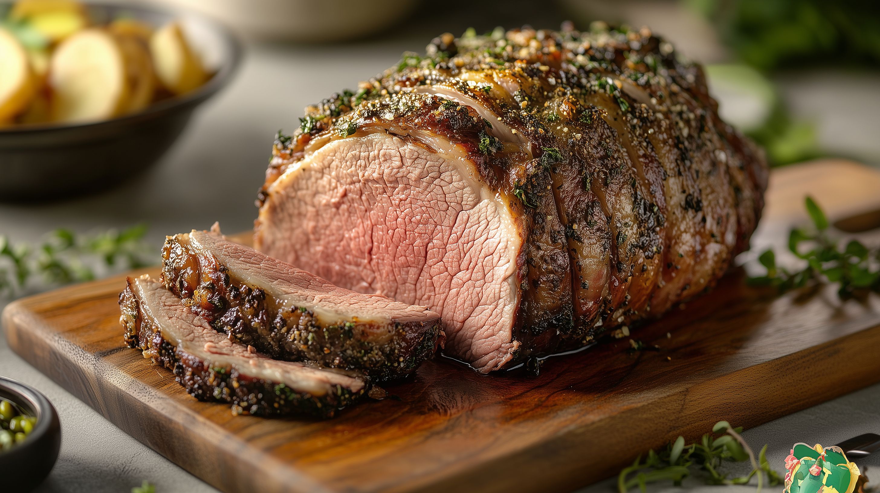 Das Foto zeigt einen saftigen Braten mit einer knusprigen Kräuterummantelung, der auf einem rustikalen Holzbrett angerichtet ist. Der Blick fällt direkt auf das leckere Fleisch, dessen rosa Farbe und Saftigkeit eine appetitliche Darstellung des Gerichts vermittelt. Der Kräuterrand verleiht dem Braten eine wunderbare Würze und optisch eine natürliche, authentische Note. Dieses hochwertige Stockfoto eignet sich perfekt für die Verwendung in Kochbüchern, Rezeptblogs, Werbung für Gastronomie oder Lebensmittel sowie Social-Media-Beiträge zum Thema Kochen und Genuss. Die Datei ist in hoher Auflösung verfügbar und unter der Creative-Commons-Lizenz für kostenlose Nutzung freigegeben.