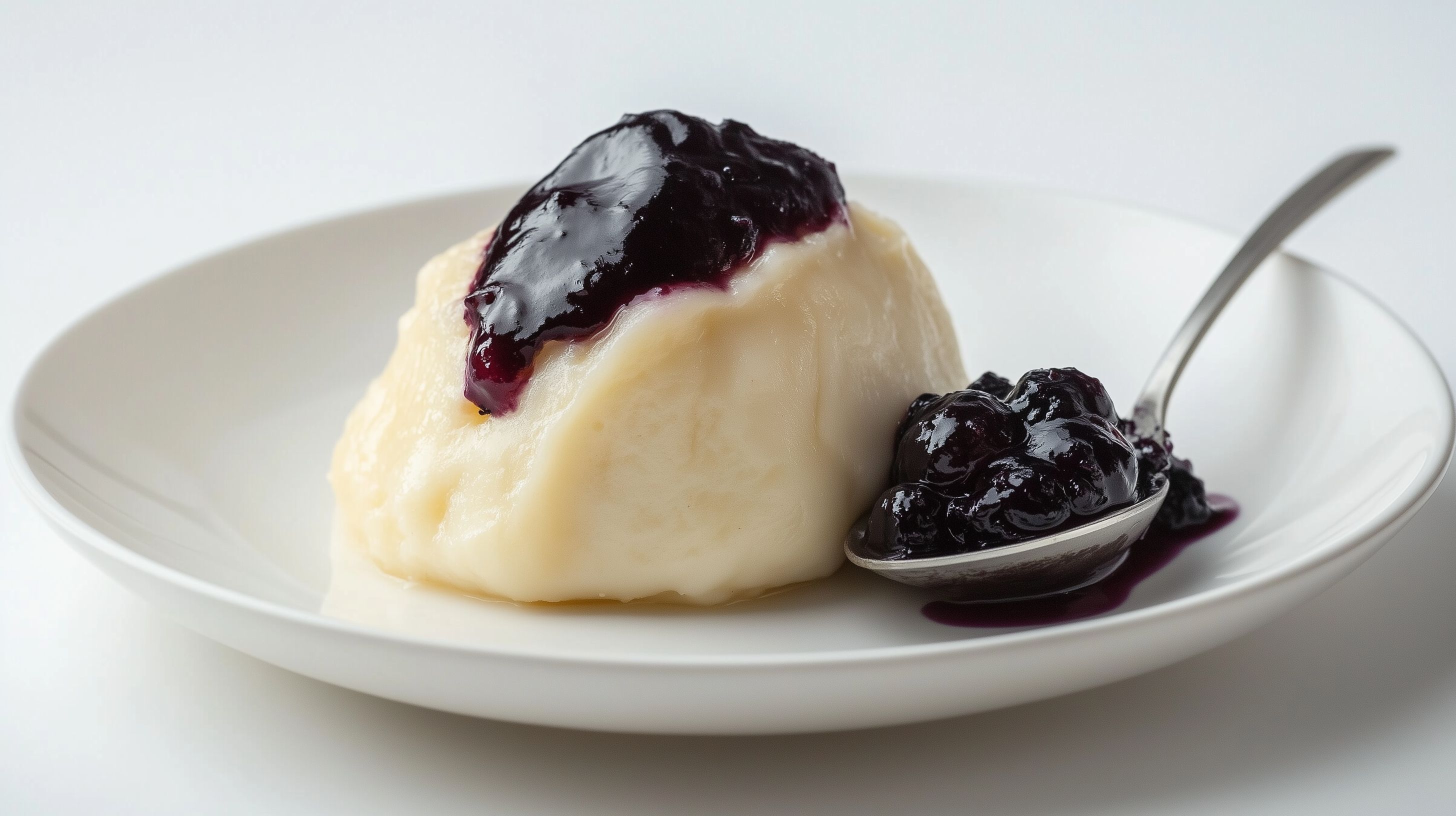Das Bild zeigt eine appetitliche Präsentation von klassischen Hefeklößen, die mit einer leckeren Blaubeersoße serviert werden. Die Klöße haben eine helle, cremige Konsistenz, die von der dunkel-violetten Blaubeersoße kontrastiert wird. Die Anordnung auf dem weißen Teller verleiht dem Gericht eine elegante, appetitliche Optik. Dieses traditionelle Dessert eignet sich hervorragend als Fotomotiv für Foodblogs, Kochbücher oder Werbung für Lebensmittel und Catering. Das hochwertige Stockfoto ist in hoher Auflösung und unter einer Creative-Commons-Lizenz frei nutzbar.