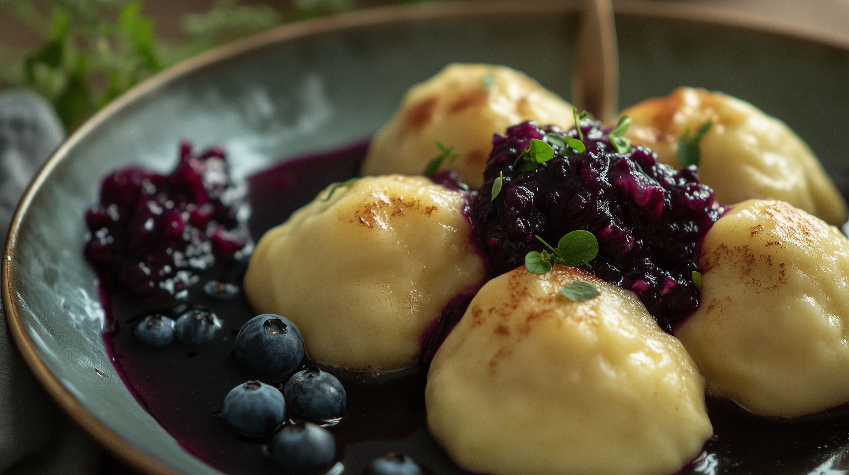 Dieses Foto zeigt ein traditionelles deutsches Dessert - gedämpfte Klusen (eine Art Kluß oder Hefeteigknödel) mit einem fruchtigen Blaubeerenkompott. Die Klusen sind goldbraun gebacken und liegen auf einer dunklen Keramikschüssel, umgeben von frischen Blaubeeren. Die Komposition ist stimmungsvoll mit den saftigen Beeren und den dezenten Farbtönen. Dieses Foto eignet sich hervorragend als Stockfoto für Rezepte, Foodblogs oder Werbung für traditionelle Desserts. Es ist in hoher Auflösung und unter einer Creative Commons-Lizenz verfügbar.