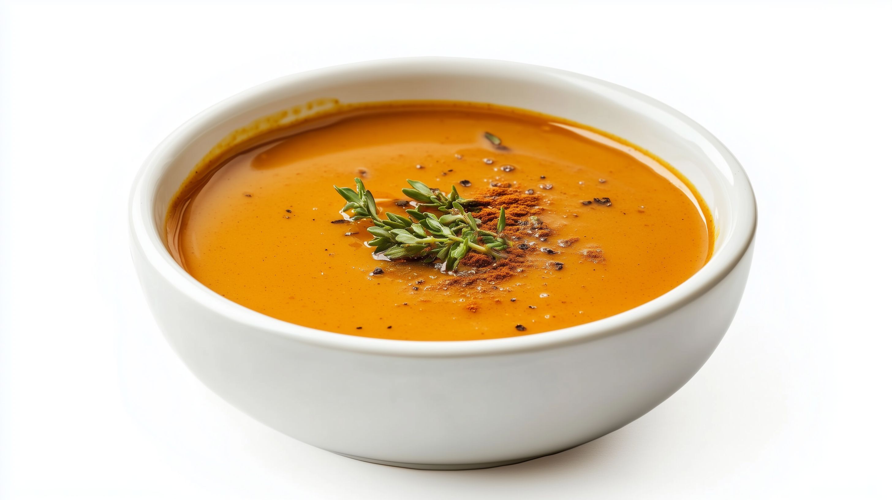 Dieses Stockfoto zeigt eine cremige Currysauce in einer weißen Schale, die mit frischem Thymian garniert ist. Die leuchtend orange Sauce hat eine samtige Konsistenz und eine appetitliche Optik. Das Foto eignet sich hervorragend für den Einsatz in Blogs, Newslettern, Social-Media-Beiträgen oder Werbekampagnen rund um das Thema Kochen, Essen und Kulinarik. Das hochauflösende Bild steht unter der Creative-Commons-Lizenz kostenlos zur Verfügung.