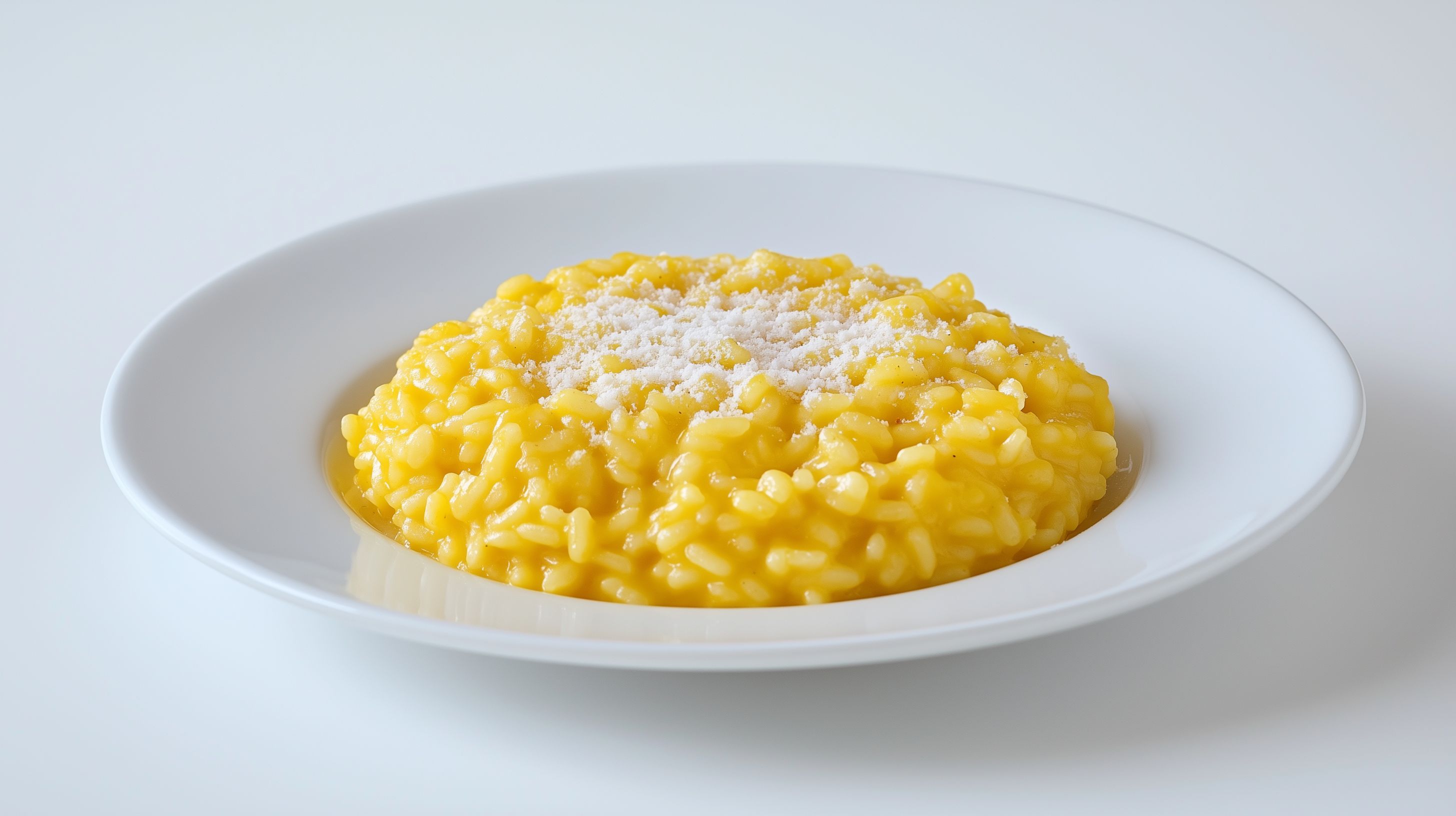 Das Foto zeigt ein leckeres Risottogericht auf einem weißen Teller. Der Risotto hat eine goldgelbe Farbe und eine cremige, weiche Konsistenz. Offensichtlich wurde der Reis mit Safran oder anderen Gewürzen zubereitet, um diese intensive Färbung zu erzielen. Oben auf dem Risotto ist etwas geriebener Parmesan zu sehen, der dem Gericht einen zusätzlichen Geschmacksschub verleiht. Das Foto könnte perfekt für die Verwendung in Kochbüchern, auf Foodblogs, in Werbekampagnen für italienische Restaurants oder für den Einsatz in Artikeln über Spezialitäten der italienischen Küche genutzt werden. Als hochwertiges Stockfoto in hoher Auflösung und unter einer Creative-Commons-Lizenz ist es für viele Zwecke frei einsetzbar.