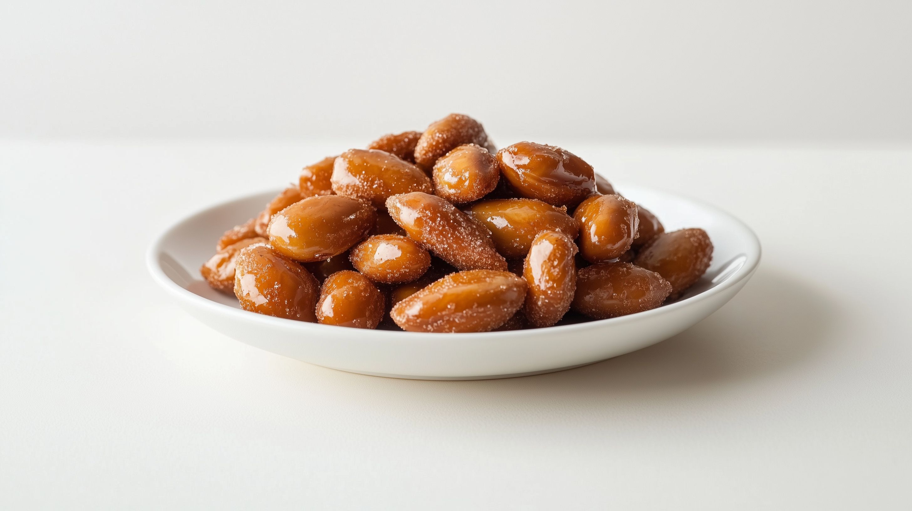 Das Foto zeigt eine Schale voller gerösteter Mandeln mit einem glänzenden, karamellisierten Überzug. Die Mandeln sind gleichmäßig in der Schale angeordnet und haben eine appetitliche, goldbraune Farbe. Der Kontrast zwischen dem hellen Porzellan-Teller und den dunklen, glänzenden Mandeln verleiht dem Bild eine natürliche, einladende Optik. Dieses Foto eignet sich hervorragend als kostenloses Stockfoto für Rezepte, Lebensmittelbeiträge oder Werbung für saisonale, gesunde Snacks. Es ist in hoher Auflösung und unter Creative-Commons-Lizenz verfügbar.