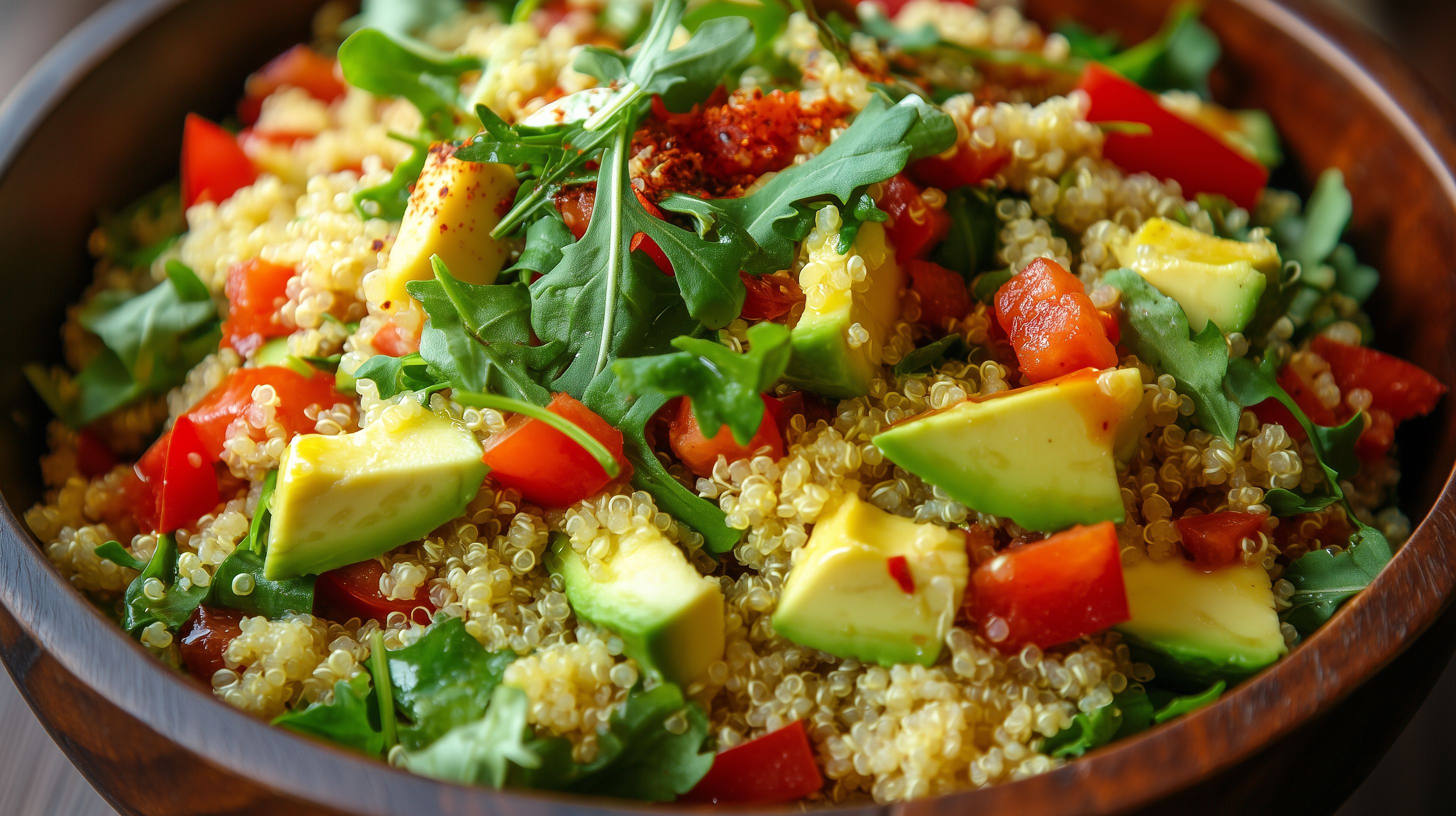 Dieses Foto zeigt einen appetitlichen Quinoa-Salat in einer rustikalen Holzschale. Der Salat ist mit frischem, buntem Gemüse wie Tomaten, Paprika und Avocado angereichert und mit grünen Rucola-Blättern garniert. Die Zutaten sind in einer ausgewogenen Komposition angeordnet, die Farben und Texturen harmonieren perfekt miteinander. Dieser Salat wäre ideal für eine gesunde Mittagspause oder ein leichtes Abendessen, aber auch als Seitengericht oder Foto für einen Foodblog geeignet. Als kostenloses Stockfoto in hoher Auflösung und unter einer Creative-Commons-Lizenz steht das Bild für vielfältige Verwendungsmöglichkeiten zur Verfügung.