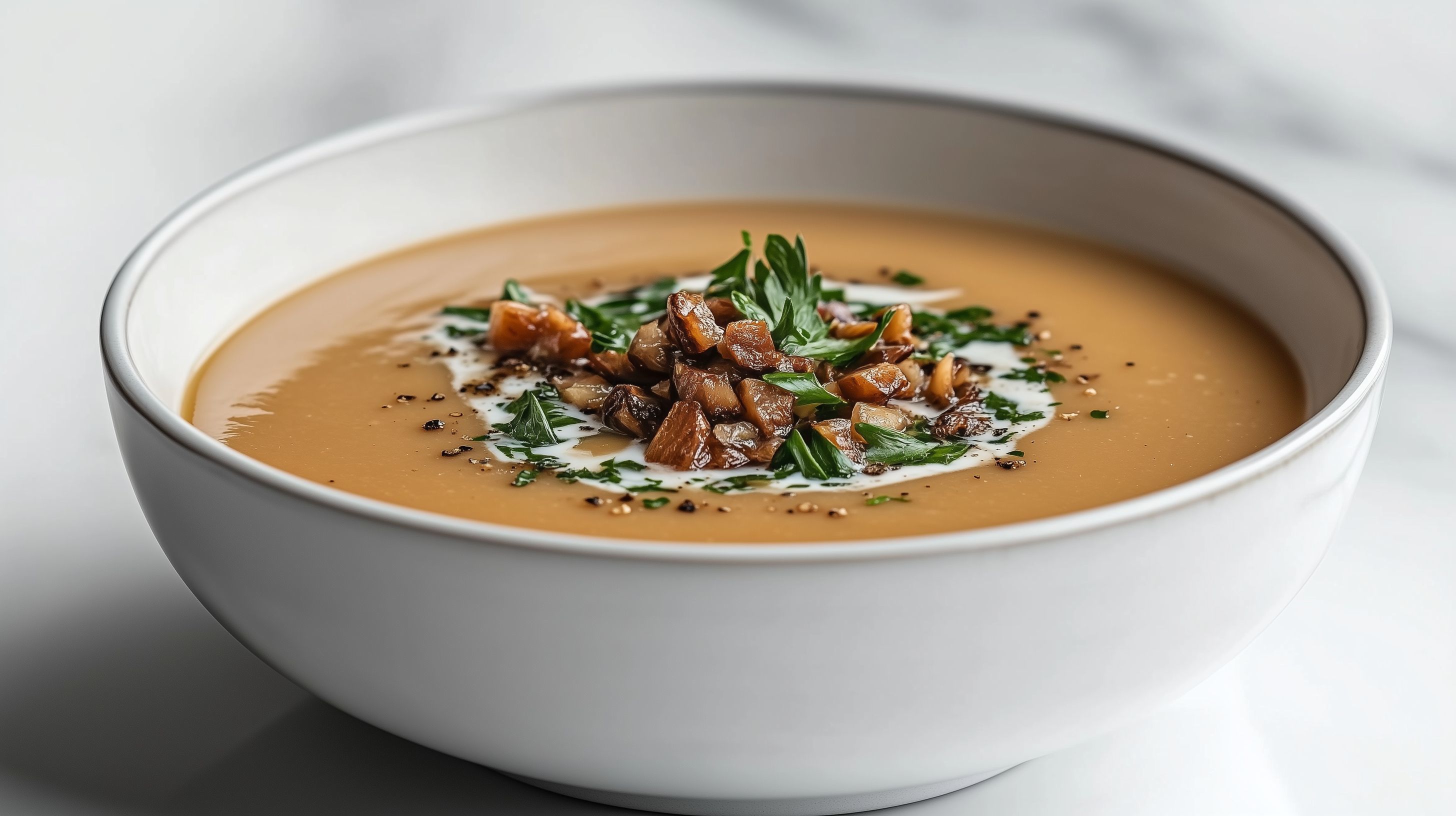 Dieses Foto zeigt eine Schüssel mit einer köstlichen, cremigen Maronensuppe. Die Suppe hat eine schöne goldene Farbe und ist mit knusprigen Toppings aus sautierter Zwiebel, Pilzen und frischen Kräutern garniert. Das Gericht ist in einer minimalistischen, weißen Schüssel angerichtet, was den Fokus ganz auf die leckere Optik und Textur der Suppe lenkt. Diese appetitliche Wintersuppe eignet sich perfekt als Vorspeise oder kleiner Eintopf und kann in Blogs, Newslettern oder Werbekampagnen zu gesunder, saisonaler Ernährung eingesetzt werden. Dieses hochauflösende Stockfoto mit Creative-Commons-Lizenz kann frei und kostenfrei verwendet werden.