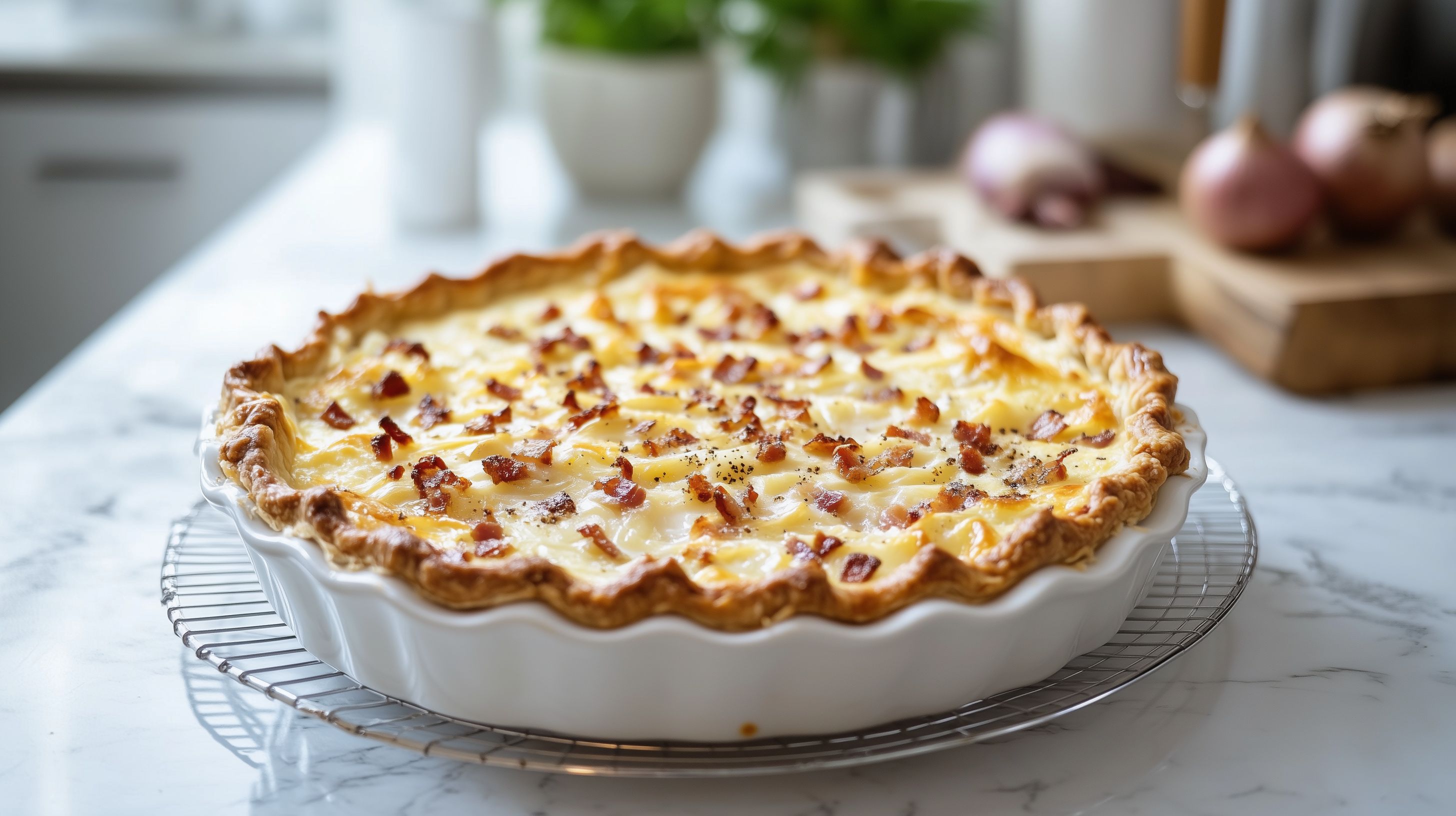 Das Bild zeigt einen frisch aus dem Ofen kommenden schwäbischen Zwiebelkuchen in einer hellen Backform auf einem Küchentisch. Der Kuchen hat eine goldbraune, knusprige Kruste und ist mit würzigen Zwiebeln und Speckstücken belegt. Im Hintergrund sind weitere Küchenutensilien und eine grüne Pflanze zu sehen, die eine gemütliche und heimelige Atmosphäre schaffen. Dieser leckere Zwiebelkuchen wäre ein perfekter Snack oder Hauptgang für ein rustikales Abendessen, einen Familienbrunch oder ein gemütliches Kaffeetrinken. Als hochwertiges, kostenloses Stockfoto in hoher Auflösung kann es vielfältig in Blogs, Newslettern, Social-Media-Beiträgen oder Werbeanzeigen eingesetzt werden.