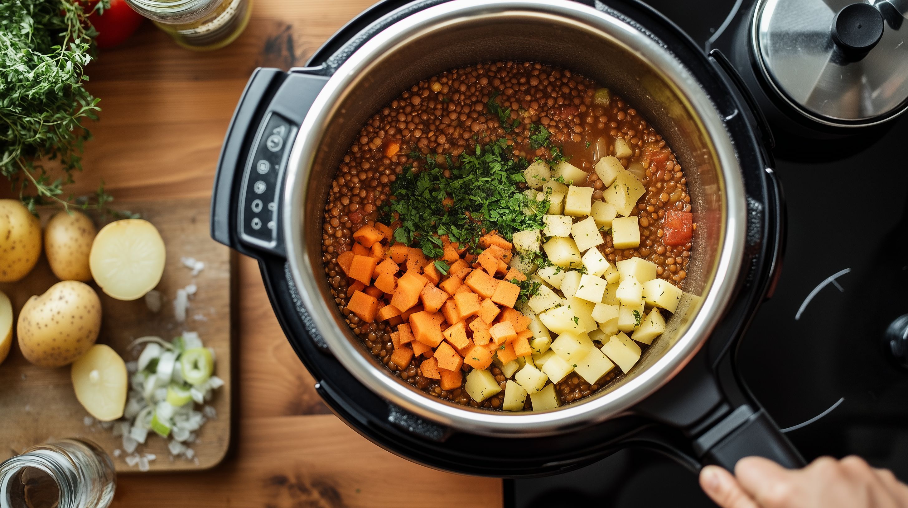 Dieses Foto zeigt eine appetitanregende Szene in einer modernen Küche. Im Fokus steht ein großer Topf mit einem leckeren Linsentopf, der gerade zubereitet wird. Die Linsen sind mit buntem Gemüse wie Karotten und Kartoffeln sowie frischen Kräutern angereichert, was dem Gericht einen natürlichen und hausgemachten Charakter verleiht. Die Zutaten sind sorgfältig arrangiert und in einem rustikalen, aber stilvollen Umfeld präsentiert. Dieses Stockfoto eignet sich hervorragend für Rezeptblog-Beiträge, Kochbücher, Werbekampagnen für gesunde Ernährung oder Social-Media-Kanäle rund um das Thema Kochen und Kulinarik. Es ist in hoher Auflösung verfügbar und unter einer Creative-Commons-Lizenz nutzbar.