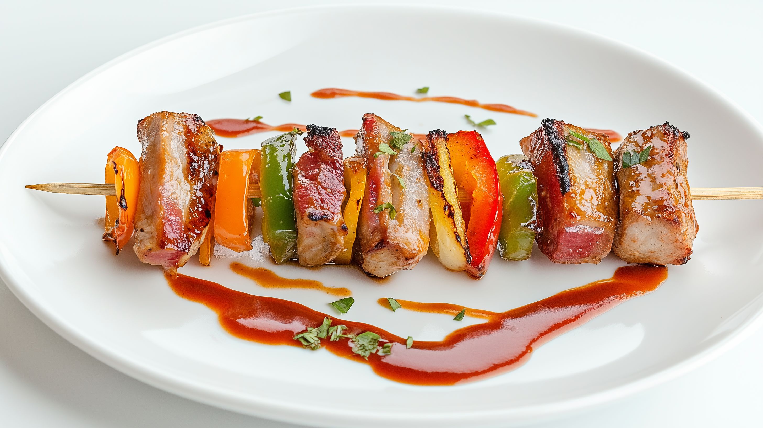 Das Foto zeigt ein appetitliches Schaschlik-Gericht, das auf einem weißen Teller angerichtet ist. Zu sehen sind verschiedene Fleischstücke, die mit buntem Gemüse wie Paprika und Zwiebeln auf Holzspießen gegrillt wurden. Die Soße, die das Fleisch umspielt, verleiht dem Gericht eine leckere, würzige Note. Das Bild ist perfekt für Rezepte, Menüs, Blog-Beiträge oder Social-Media-Posts rund um die mediterrane Küche, Grillgerichte oder Fleischspezialitäten. Als kostenloses Stockfoto in hoher Auflösung und unter Creative-Commons-Lizenz lässt es sich vielfältig einsetzen.