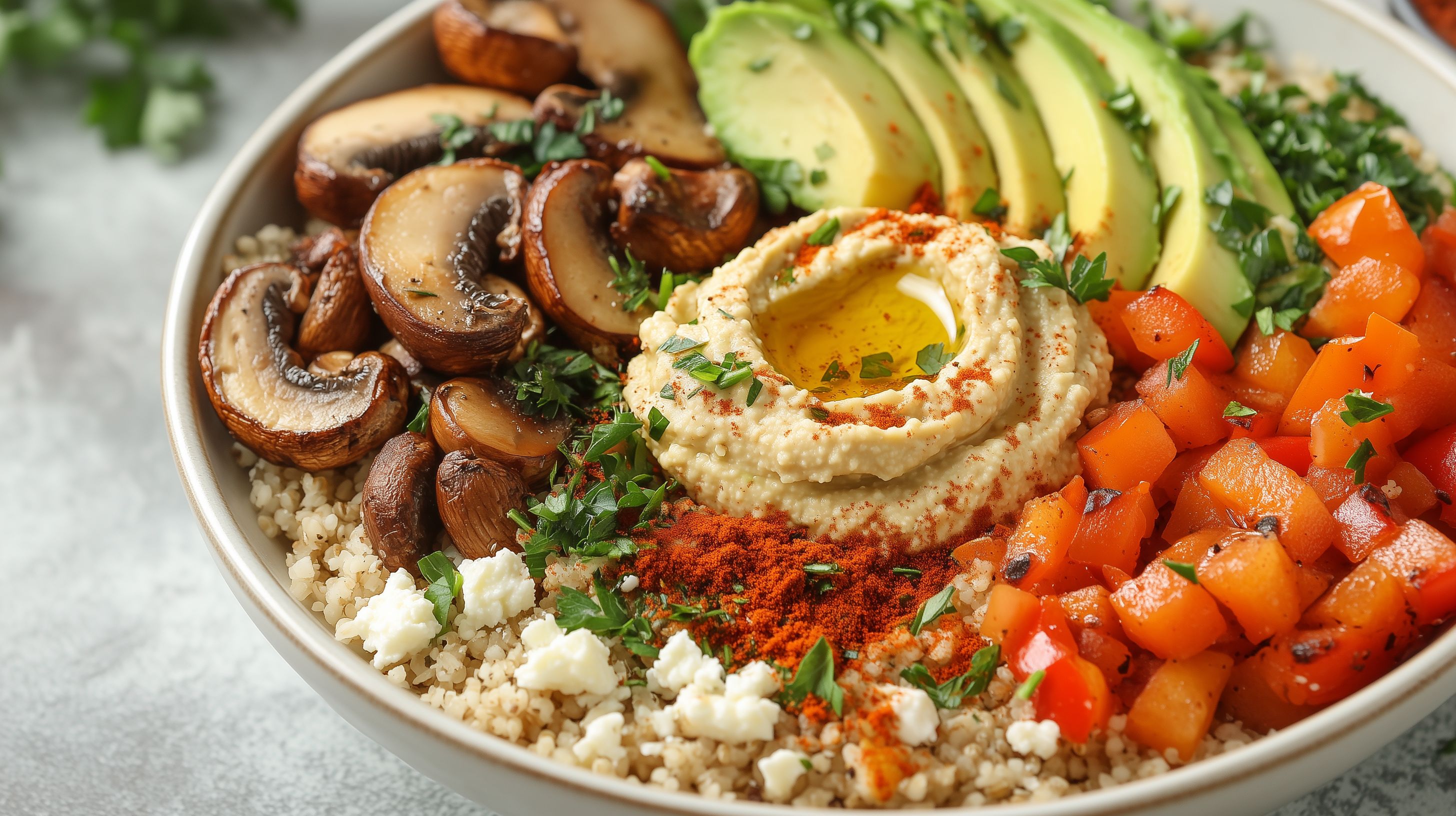 Dieses köstliche Foto zeigt eine vegetarische Buddha-Bowl, die aus einer Vielzahl an frischen, bunten Zutaten zusammengestellt wurde. Im Mittelpunkt steht ein Bett aus Couscous, umgeben von saftigen Champignons, knackigem Paprika, cremigem Hummus und reifen Avocadostücken. Das Ganze ist mit feinen Kräutern dekoriert und verleiht dem Gericht einen appetitlichen, gesunden Eindruck. Diese nährwertreiche Schüssel eignet sich hervorragend als Mittagessen oder leichtes Abendessen und lässt sich wunderbar für Foodblogs, Social-Media-Posts oder Werbezwecke einsetzen. Das hochauflösende Foto steht unter einer Creative-Commons-Lizenz kostenlos zum Download bereit.