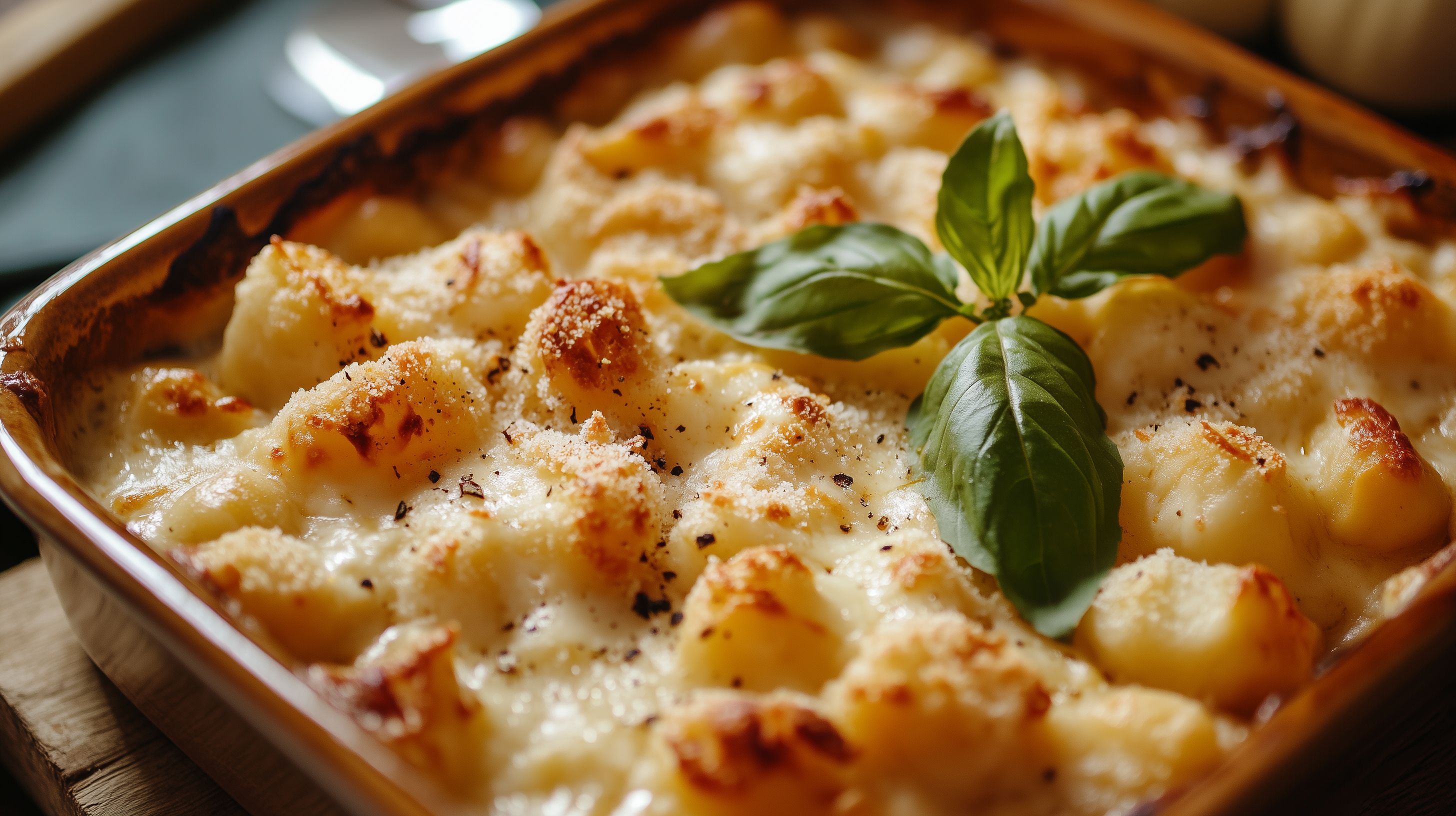 Dieses Foto zeigt ein leckeres Backofengericht, bestehend aus Ofengemüse mit einer knusprigen Käsehaube. Zu sehen sind goldbraun gebackene Kartoffeln und Kürbis in einer ovalen Auflaufform. Grüne Basilikumblätter verleihen dem Gericht einen italienischen Flair. Das rustikale Design mit der Holztischplatte im Hintergrund erzeugt eine gemütliche Stimmung. Das hochauflösende Bild eignet sich hervorragend für den Einsatz in Blogs, Newslettern, Social-Media-Beiträgen oder Werbematerialien zum Thema Kochen und Rezepte. Als kostenloses Stockfoto unter der Creative-Commons-Lizenz kann es frei genutzt werden.