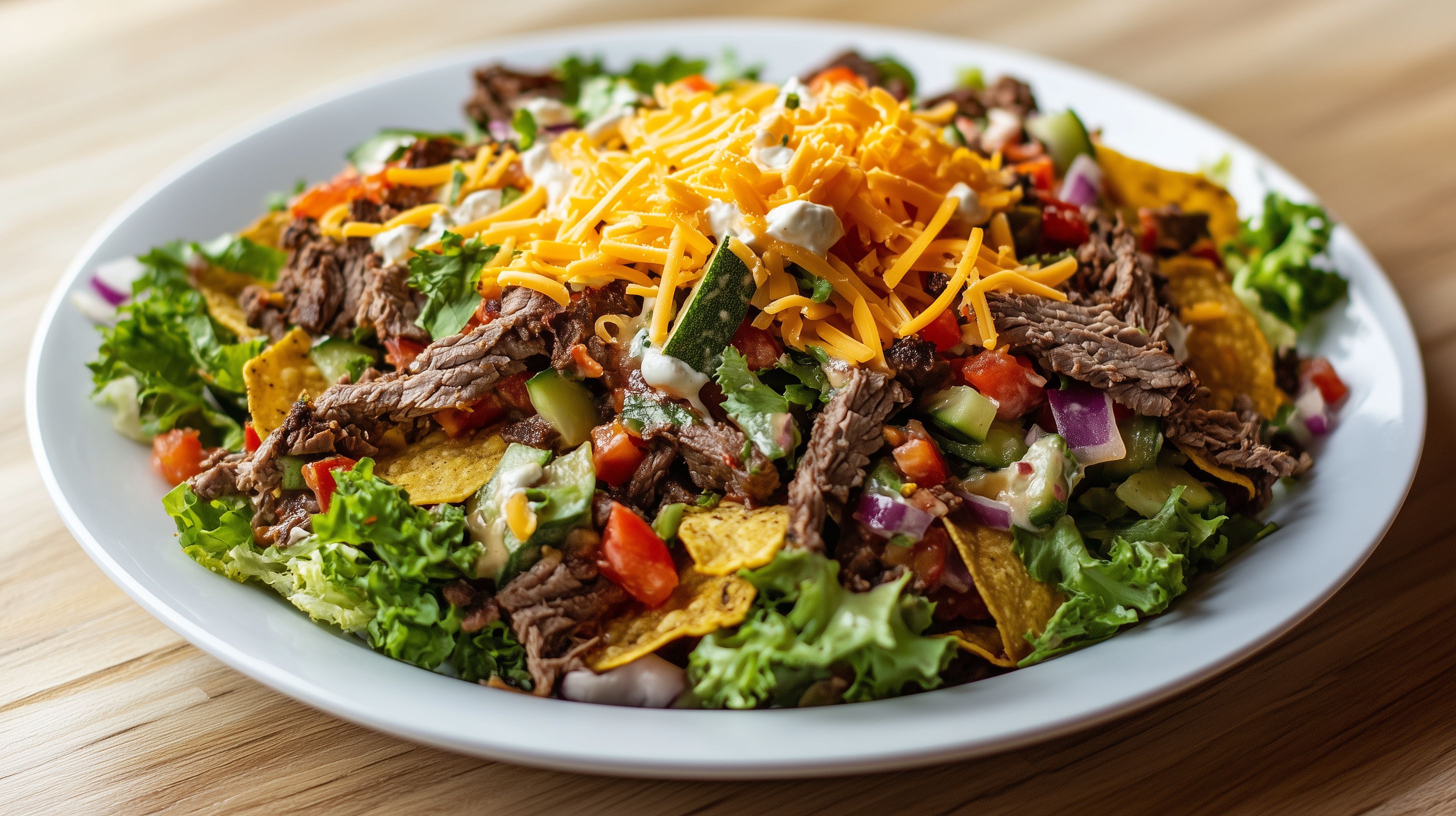 Dieses köstliche Foto zeigt einen leckeren Taco-Salat mit saftigen Rindfleischstreifen, frischem Gemüse wie Tomaten, Gurken und Zwiebeln sowie knusprig gerösteten Tortilla-Chips und würzigem Cheddar-Käse. Die farbenfrohe und appetitliche Komposition auf einem rustikalen Holzteller macht Lust auf ein gesundes, mexikanisch inspiriertes Mittagessen oder Abendessen. Dieses hochauflösende Stockfoto eignet sich perfekt für Blogartikel, Social-Media-Posts, Speisekarten oder Werbekampagnen rund um die Themen Kulinarik, Ernährung und gesunde Lebensweise. Es ist unter einer Creative-Commons-Lizenz frei verwendbar.