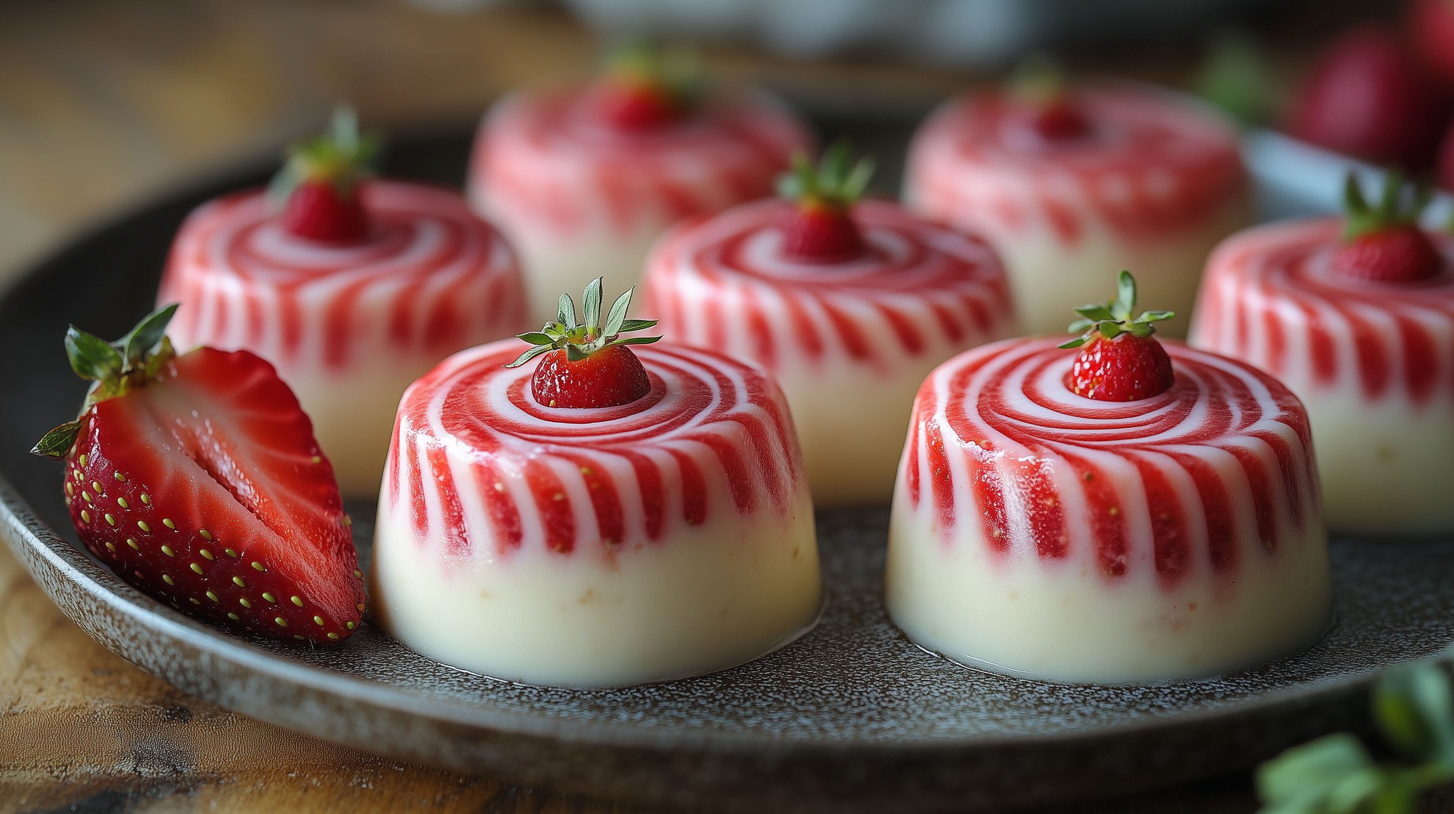 Das Bild zeigt eine Auswahl dekorativer Erdbeerfrozen-Joghurt-Desserts auf einem rustikalen Holztisch. Die rosafarbenen Häppchen sind mit einem auffälligen Streifenmuster aus roter Erdbeerkreme und weißem Joghurt verziert und wurden jeweils mit einer frischen Erdbeere garniert. Die Anordnung der Häppchen auf dem dunklen Teller sowie die natürlichen Farben und Texturen erzeugen eine appetitliche, einladende Atmosphäre. Dieses Stockfoto in hoher Auflösung kann ideal für Beiträge in Foodblogs, Rezeptsammlungen, Social-Media-Posts oder Werbekampagnen rund um Süßspeisen und Desserts verwendet werden und steht unter der Creative-Commons-Lizenz zur kostenlosen Nutzung zur Verfügung.