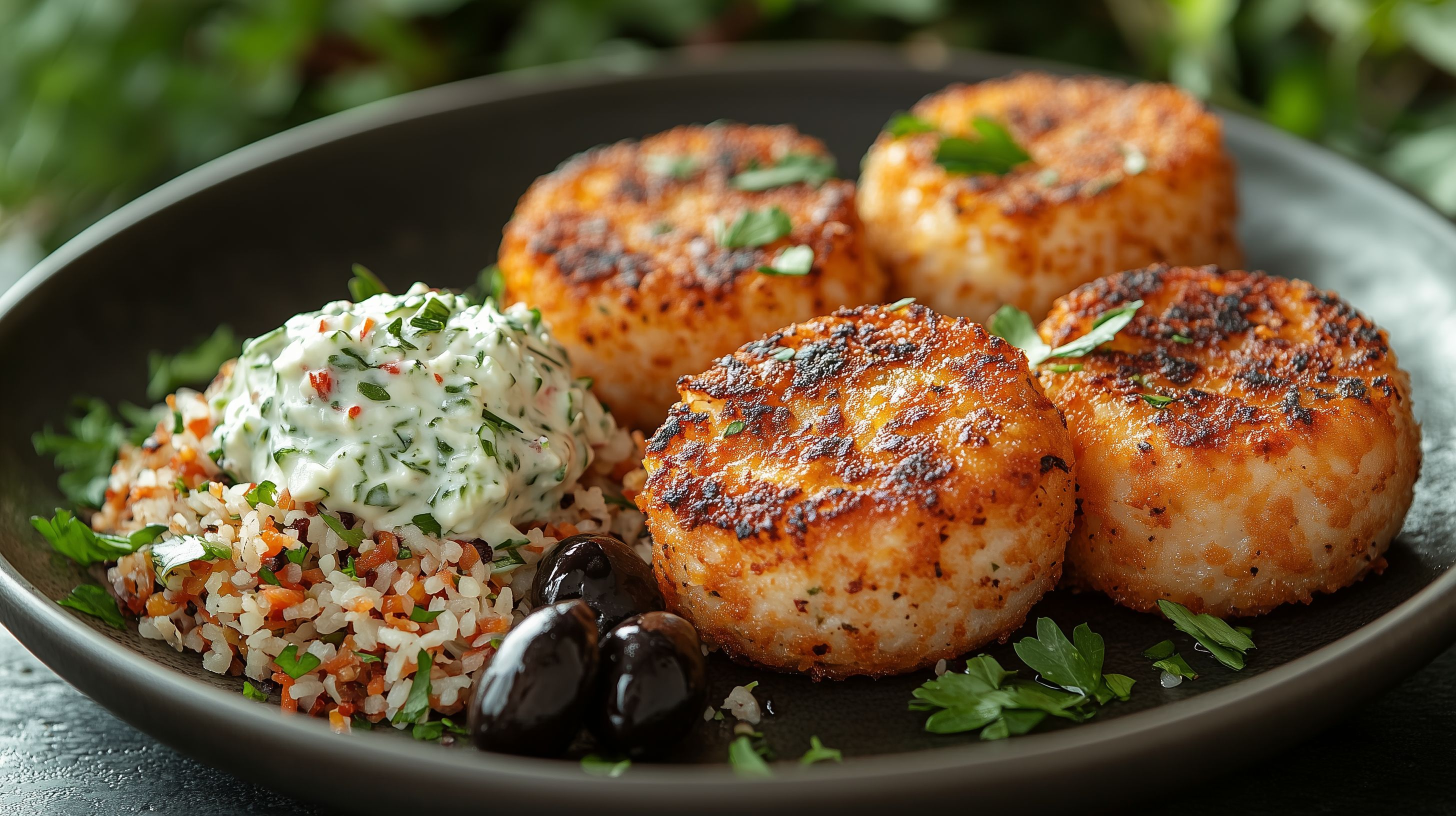Dieses Foto zeigt eine appetitlich angerichtete Portion goldbraun gebratener Kartoffelpuffer, serviert auf einem schwarzen Teller. Die Kartoffelbällchen sind knusprig an der Oberfläche und saftig im Inneren. Dazu gibt es einen frischen Salat aus gehackten Gurken, Tomaten und Petersilie sowie einige Oliven. Die Zutaten schaffen eine ausgewogene und gesunde Mahlzeit, die sowohl als Vorspeise als auch als Hauptgericht genossen werden kann. Das Foto eignet sich hervorragend für den Einsatz in Rezeptbüchern, Kochzeitschriften oder auf Foodblogs, um den Appetit der Betrachter anzuregen. Als hochwertiges, kostenloses Stockfoto in hoher Auflösung unter Creative-Commons-Lizenz kann es vielfältig in der Onlinekommunikation, Werbung und Produktpräsentation verwendet werden.