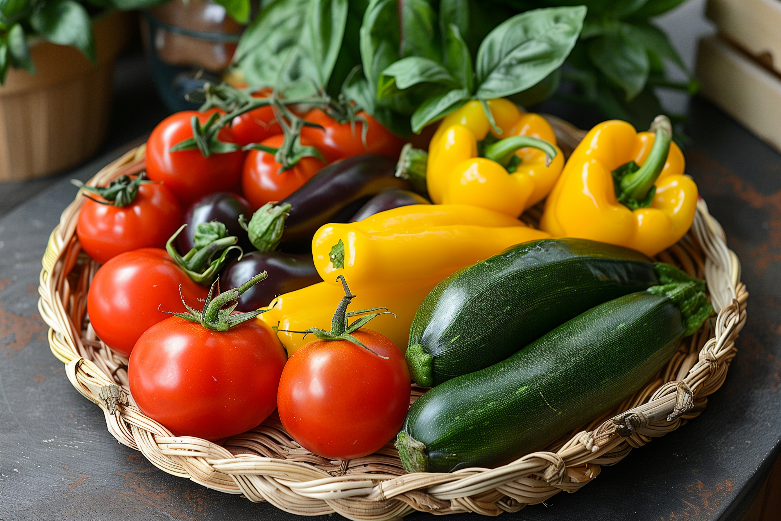 Das Bild zeigt eine Auswahl an frischem, buntem Gemüse in einer Holzkiste. Im Vordergrund sind saftig rote Tomaten, gelbe Paprika und grüne Zucchini zu sehen, umrahmt von dunkelgrünen Basilikumblättern. Der dunkle Hintergrund lässt die Farben und Formen des Gemüses besonders gut zur Geltung kommen und erzeugt einen schönen Kontrast. Diese Aufnahme eignet sich hervorragend für den Einsatz in Blogs, Newslettern, Social-Media-Kanälen oder Werbekampagnen rund um gesunde Ernährung, Kochen, Landwirtschaft oder einen nachhaltigen Lebensstil. Als kostenloses Stockfoto in hoher Auflösung und unter einer Creative-Commons-Lizenz verfügbar, kann dieses Bild vielseitig genutzt werden.