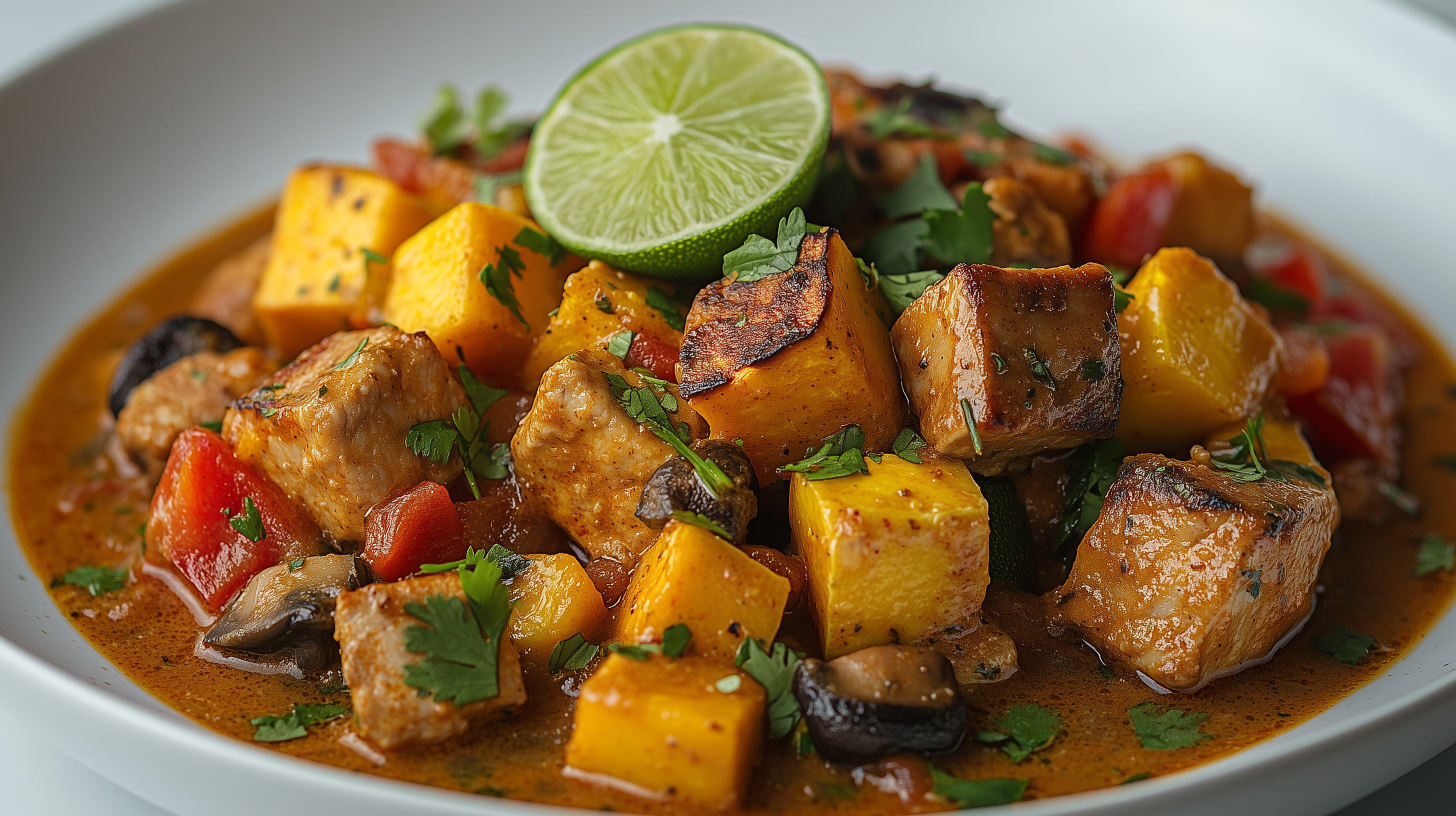 Dieses Foto zeigt ein köstliches und farbenfrohes Gericht - ein würziges Kürbiscurry mit frischen Limettenscheiben und Kräutern. Die Komposition ist sehr appetitlich und lädt förmlich zum Mitessen ein. Das Gericht besticht durch seine intensive Farbgebung in Orangetönen, die durch die Zugabe von Paprika und Kräutern noch verstärkt wird. Die Limette sorgt für einen erfrischenden Akzent und rundet das Gesamtbild perfekt ab. Dieses kostenlose Stockfoto in hoher Auflösung eignet sich hervorragend für Rezeptblogs, Kochzeitschriften oder Social-Media-Posts rund um leckere, gesunde und vegetarische Gerichte. Es steht unter einer Creative-Commons-Lizenz zur freien Verwendung zur Verfügung.