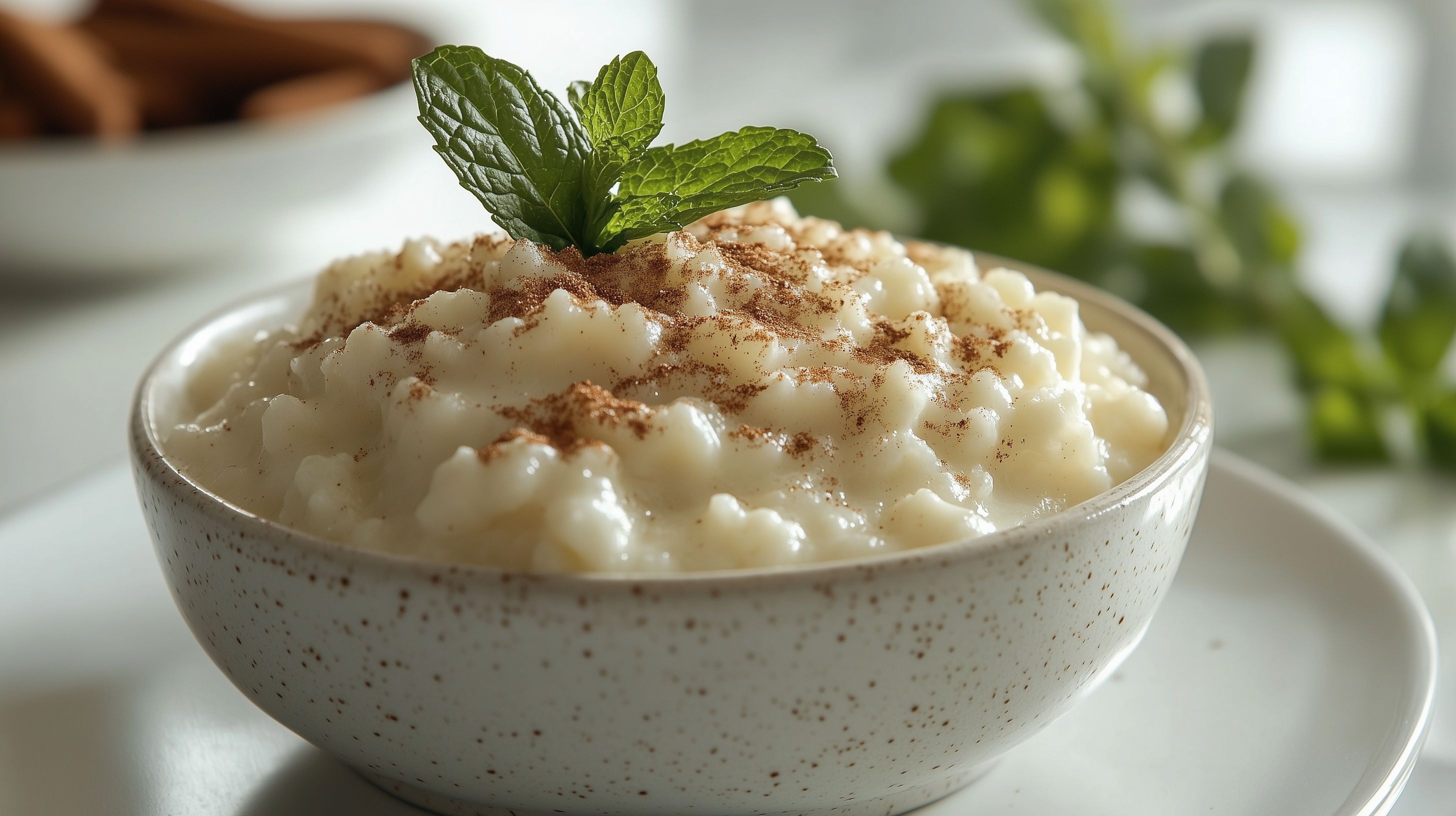 Dieses Foto zeigt einen cremigen Milchreis, der mit Zimt und frischer Minze garniert ist. Die Speise wird in einer rustikalen, gefleckten Schüssel serviert, die einen schönen Kontrast zu den hellen und grünen Farbtönen bietet. Das Bild strahlt eine gemütliche und einladende Atmosphäre aus. Das hochauflösende Foto eignet sich perfekt als kostenloses Stockfoto für Blogs, Newsletter oder Social-Media-Beiträge zum Thema Kochen, Backen oder Desserts. Es steht unter einer Creative Commons-Lizenz zur Verfügung.