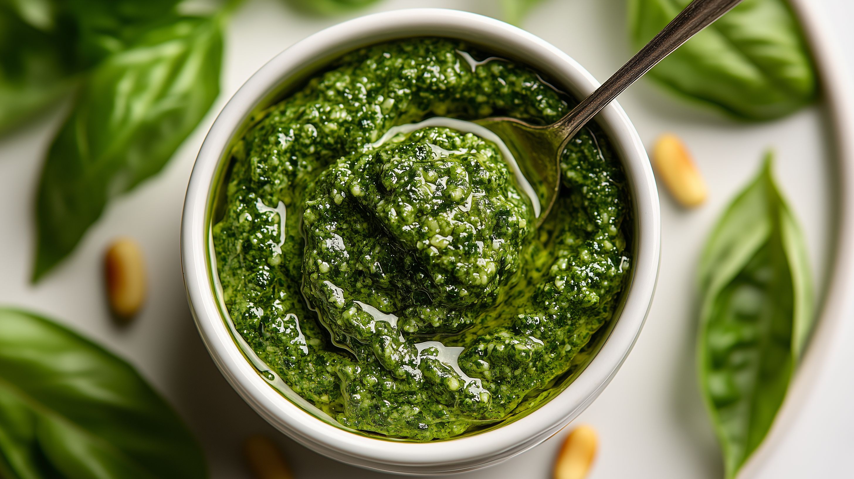 Dieses Foto zeigt ein cremiges, grünes Kräuterpesto in einer weißen Keramikschale. Die Schale ist von frischen Kräuterblättern umgeben, die den natürlichen und frischen Charakter des Pesto betonen. Das Pesto hat eine homogene, weiche Konsistenz und eine intensive, grüne Farbe, die auf die verwendeten Zutaten wie Basilikum, Spinat und Olivenöl hinweisen. Dieses Foto eignet sich hervorragend als kostenloses, hochauflösendes Stockfoto für den Einsatz in Kochblogs, Rezeptsammlungen, Werbematerialien oder Social-Media-Kanälen zum Thema gesunde, natürliche Ernährung und vegetarische Küche. Es steht unter einer Creative-Commons-Lizenz zur freien Nutzung zur Verfügung.