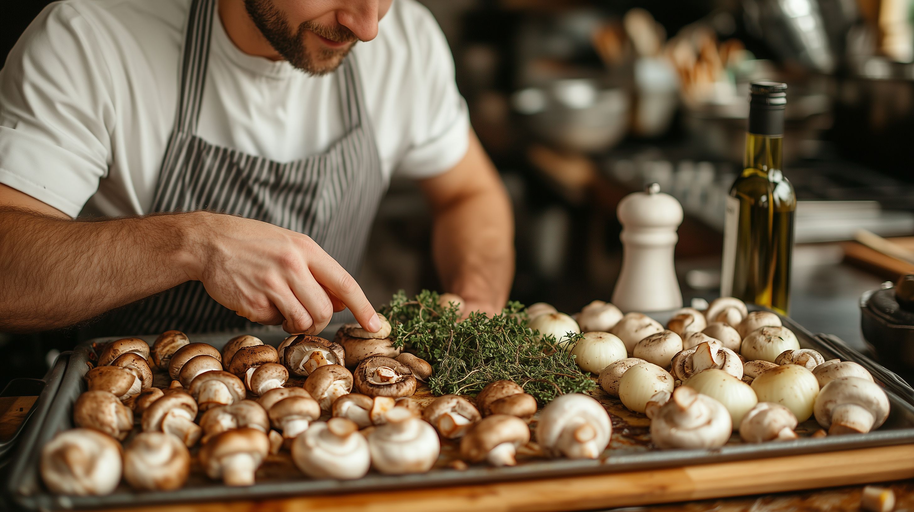 Das Bild zeigt einen Koch, der in einer modernen Küche frische Pilze und Kräuter für ein Gericht zubereitet. Der Fokus liegt auf der Nahaufnahme der Zutaten, die auf einer rustikalen Holzoberfläche angeordnet sind. Der Hintergrund ist dunkel gehalten, so dass der Betrachter ganz auf die Handarbeit des Küchenchefs konzentriert ist. Das Foto eignet sich perfekt als kostenloses Stockfoto für Blogs, Newsletter oder Social-Media-Posts rund um die Themen Gastronomie, Kochen und Ernährung. Die hohe Bildqualität und die kreative Perspektive machen es zu einem attraktiven, frei verfügbaren Bild unter Creative-Commons-Lizenz.