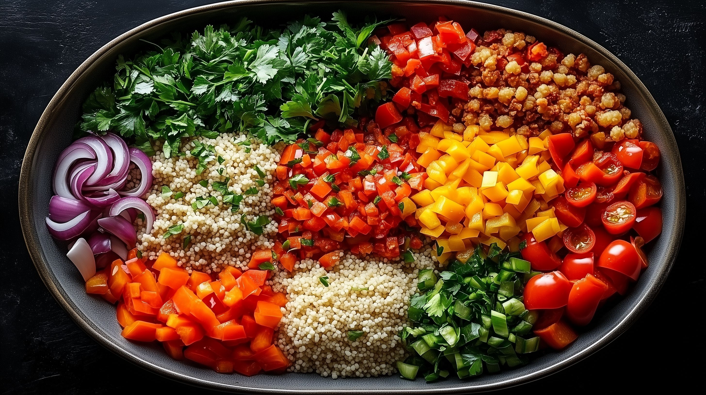 Dieses farbenfrohe Stockfoto zeigt ein appetitliches Gericht aus frischem Gemüse und Couscous in einer rustikalen Schüssel. Die Komposition der verschiedenen Gemüsearten wie Paprika, Tomate, Zwiebel und Kräuter ergibt ein einladendes und stimmungsvolles Bild. Es eignet sich hervorragend für Rezeptblogbeiträge, Social-Media-Posts oder Werbeanzeigen rund um gesunde Ernährung, Kochen und mediterrane Küche. Das hochauflösende Foto ist unter einer Creative-Commons-Lizenz frei nutzbar.