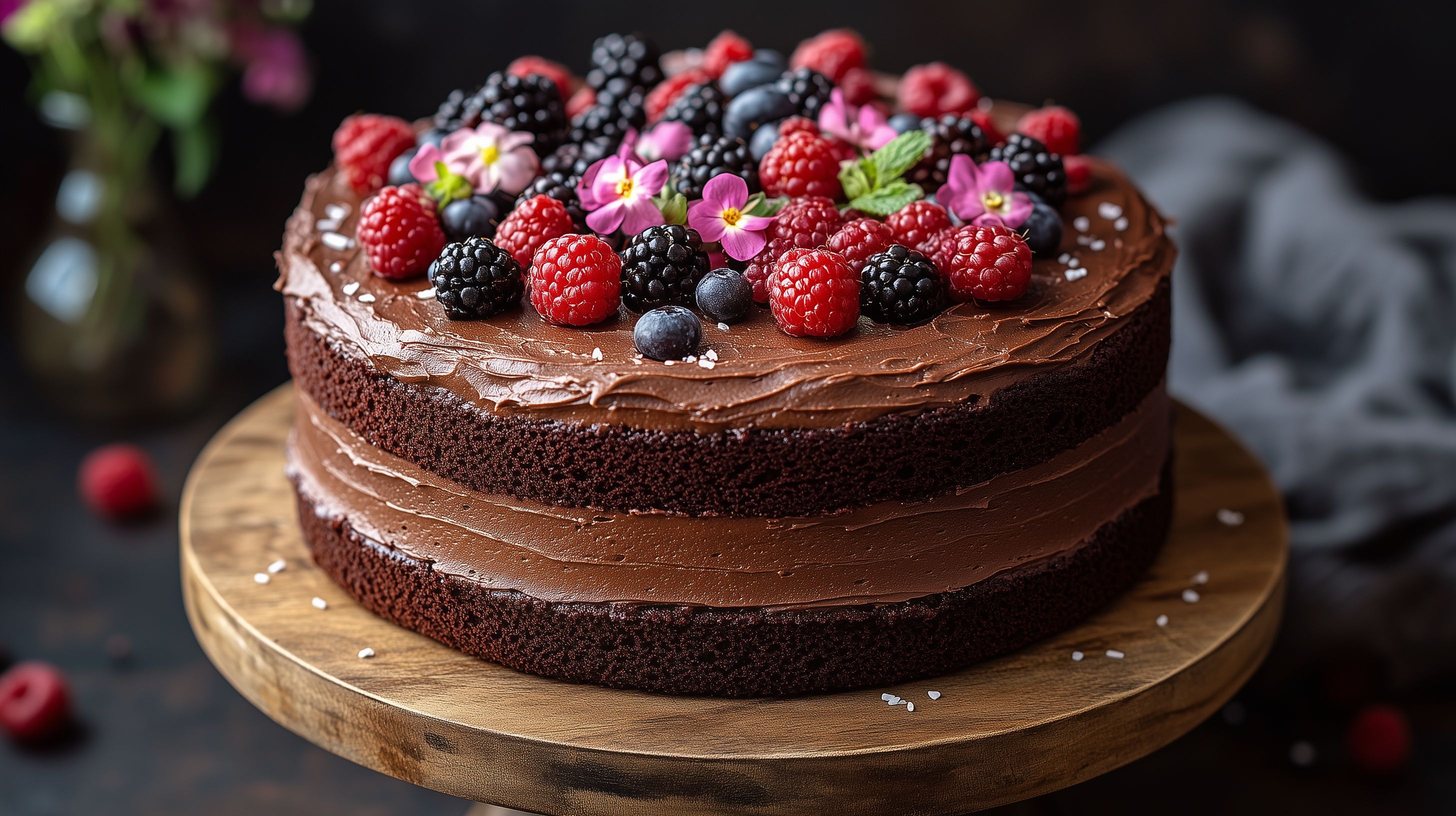 Dieses detailreiche Bild zeigt eine verlockende Schokoladentorte, die mit einer Vielzahl an frischen Beeren und essbaren Blüten dekoriert ist. Die Torte ist auf einem hölzernen Untergrund platziert und hebt sich durch die dunkle Hintergrundfarbe wirkungsvoll ab. Die üppige Dekoration und der rustikale Stil verleihen dem Dessert ein appetitliches, genussvolles Erscheinungsbild. Dieses hochauflösende Stockfoto eignet sich ideal für den Einsatz in Blogs, Newslettern, Social-Media-Beiträgen oder Werbematerialien rund um das Thema Backen, Desserts und leckere Köstlichkeiten. Das Bild steht unter einer kostenlosen Creative-Commons-Lizenz zur Verfügung.