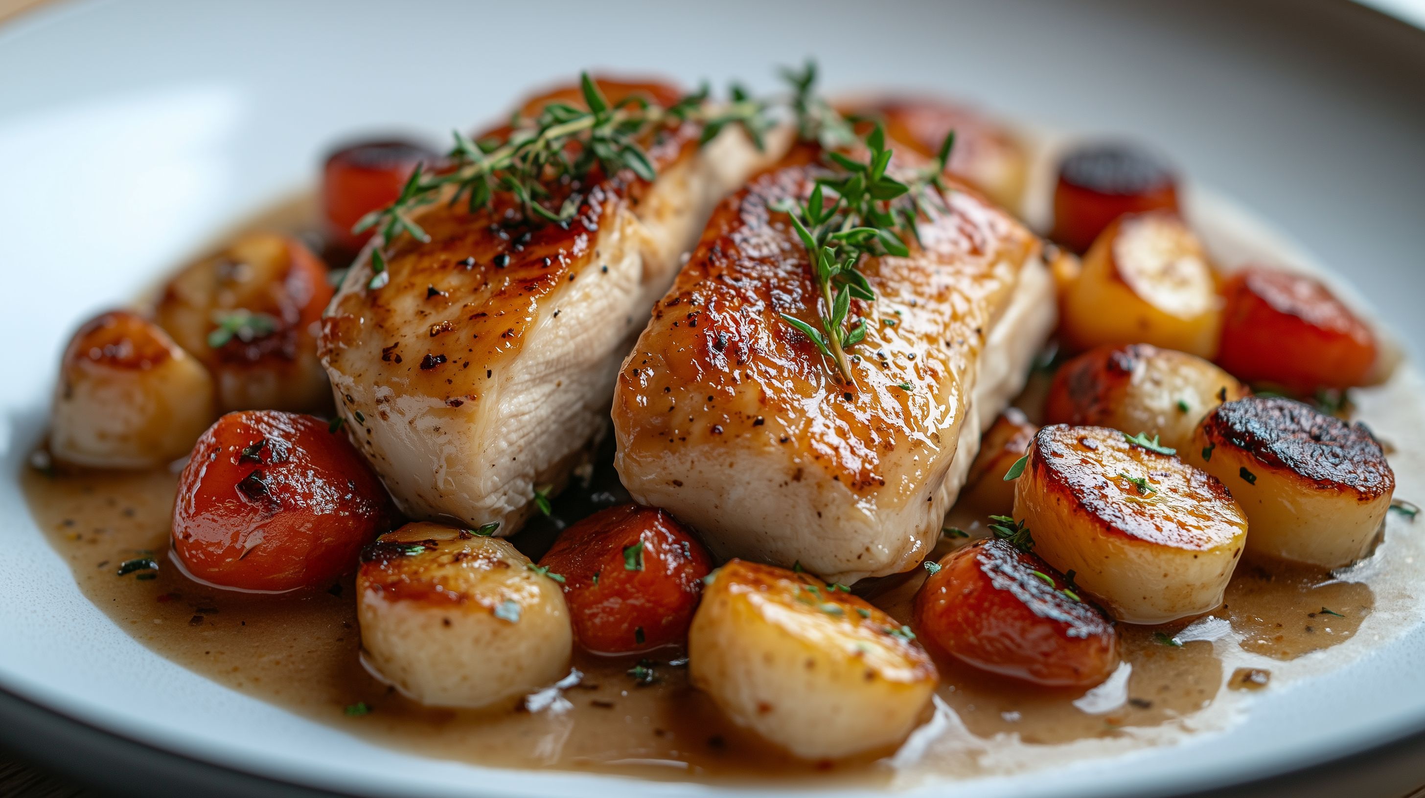Das Bild zeigt eine köstliche Hähnchenbrust, die mit einer glänzenden, glasierten Marinade überzogen ist und mit gebratenen Kartoffeln und Kirschtomaten auf einem weißen Teller angerichtet wurde. Die Speise ist mit frischen Kräutern wie Thymian dekoriert, was ihr einen appetitlichen, rustikalen Charakter verleiht. Dieses hochwertige Stockfoto eignet sich hervorragend für Rezeptsammlungen, Kochbücher, Werbematerial für Catering-Anbieter oder Beiträge in Foodblogs und Lifestyle-Magazinen. Das Bild ist in hoher Auflösung und unter einer Creative-Commons-Lizenz frei verwendbar.