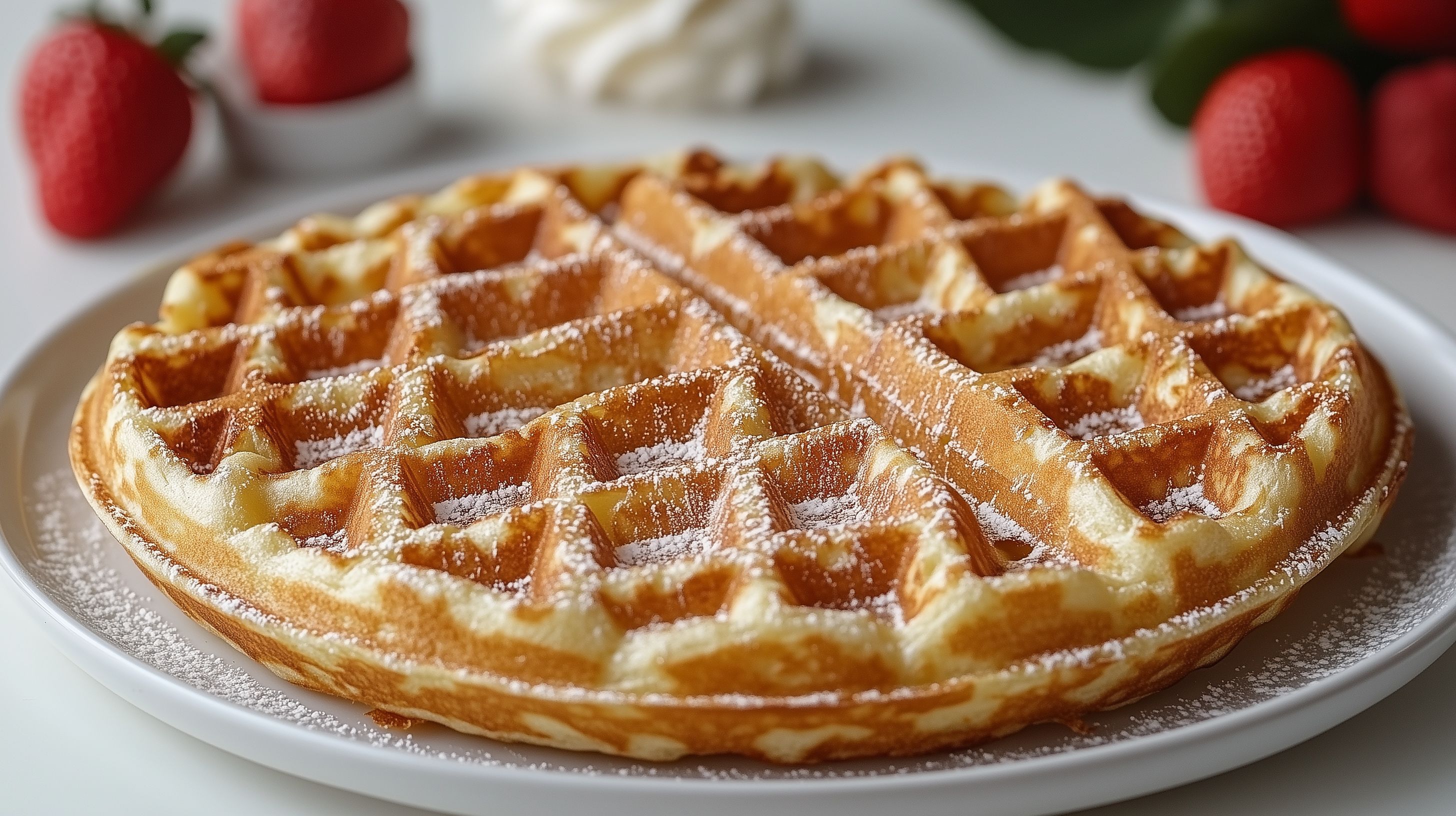 Dieses Foto zeigt eine appetitlich aussehende belgische Waffel, die mit feinem Puderzucker bestäubt und mit frischen, saftigen Erdbeeren dekoriert ist. Die Waffel ist goldbraun gebacken und weist eine knusprige Oberfläche auf, die zu einem köstlichen Geschmackserlebnis einlädt. Das Foto wurde vermutlich in einer hellen, natürlichen Umgebung aufgenommen, was die Farben und Texturen der Zutaten optimal zur Geltung bringt. Dieses hochauflösende Stockfoto unter Creative-Commons-Lizenz eignet sich hervorragend für Rezeptblogs, Kochbücher, Werbeanzeigen oder Social-Media-Kanäle rund um Backen, Frühstück oder Desserts.