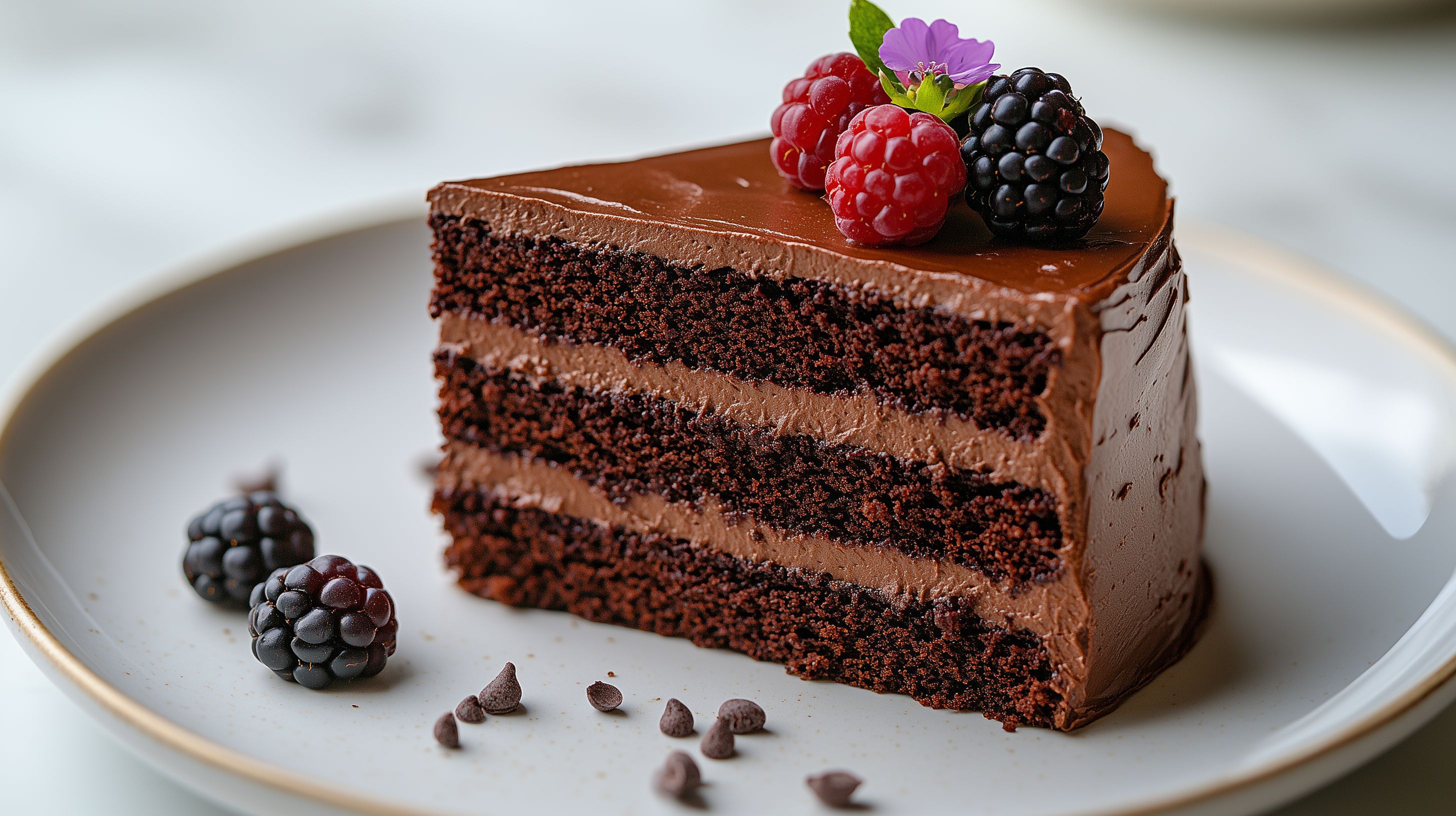 Das Bild zeigt einen üppigen, mehrschichtigen Schokoladenkuchen, der mit einer dicken Schicht cremiger Schokoladenglasur überzogen ist. Darauf sind frische Himbeeren, Brombeeren und eine violette Blüte dekorativ angeordnet. Der Kuchen hat eine dunkelbraune, satte Farbe und wirkt sehr appetitlich. Die Komposition des Fotos ist ausgewogen und fokussiert ganz auf das leckere Dessert. Das Bild eignet sich hervorragend für die Verwendung in Blogs, Newslettern oder Social-Media-Beiträgen zum Thema Backen, Kaffeetafel oder Genuss. Als kostenloses Stockfoto in hoher Auflösung und unter Creative-Commons-Lizenz ist es flexibel einsetzbar.