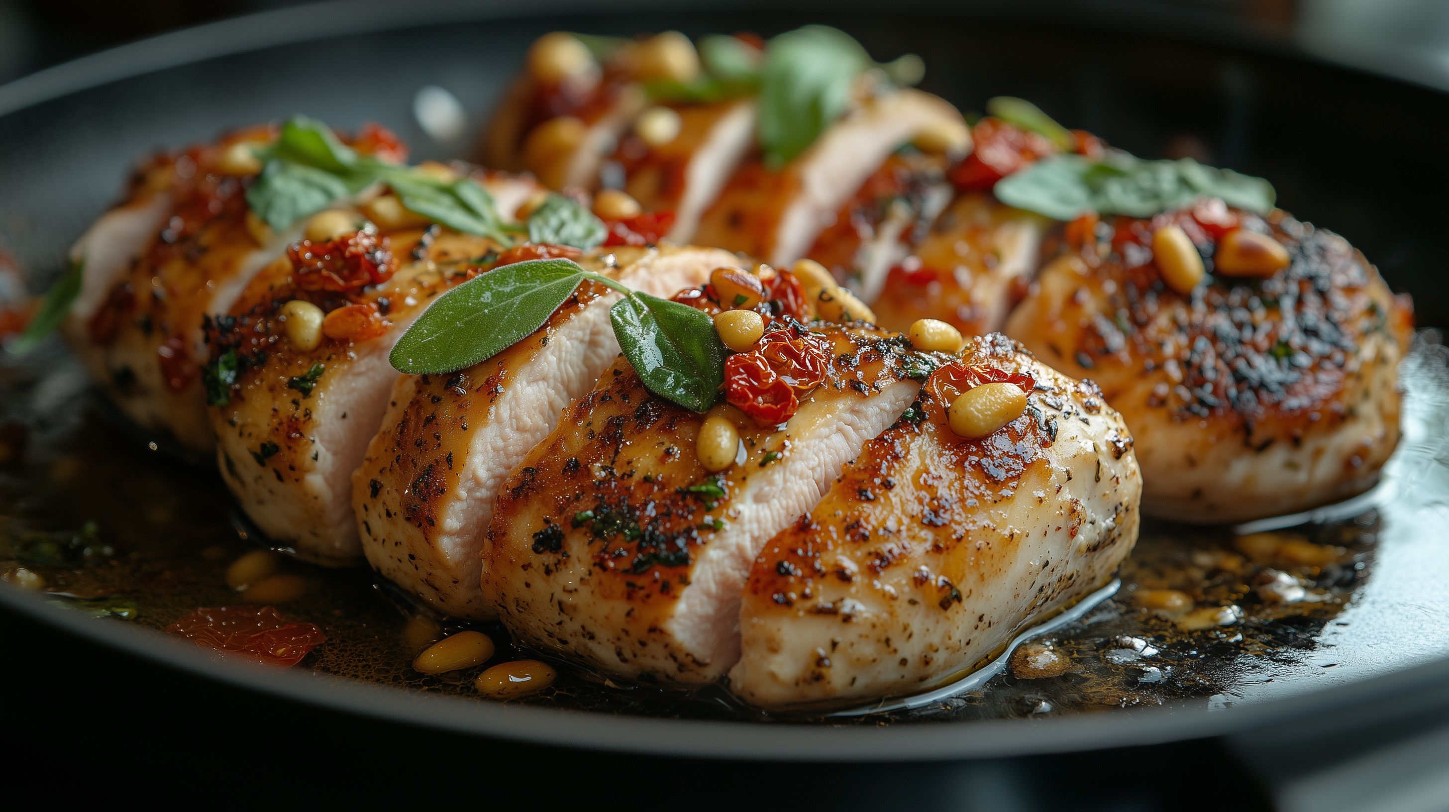 Dieses Stockfoto zeigt eine appetitlich angerichtete Hähnchenbrust, die mit einer Mischung aus Pinienkerne, Kräutern und getrockneten Tomaten garniert ist. Das Gericht ist in einem rustikalen, dunklen Teller platziert, was dem Bild eine stimmungsvolle Atmosphäre verleiht. Die detailreiche Aufnahme der Hauptspeise lässt den Betrachter den Geschmack des Gerichts förmlich erahnen. Dieses hochauflösende Stockfoto eignet sich perfekt für den Einsatz in Blogs, Newslettern, Social-Media-Beiträgen oder Werbematerialien rund um das Thema Kochen und gesunde Ernährung. Es steht unter einer Creative-Commons-Lizenz zur kostenfreien Verwendung zur Verfügung.