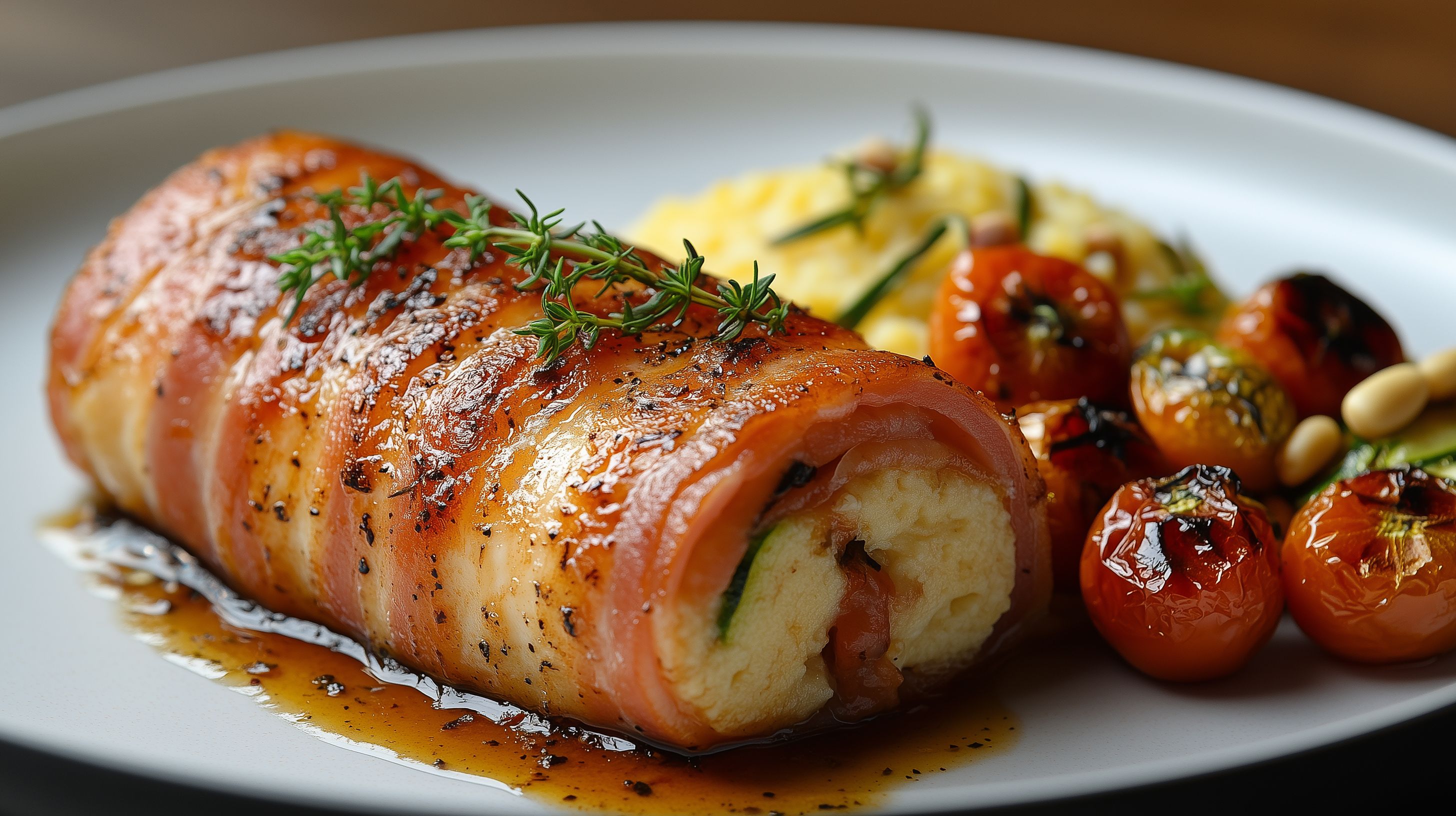 Das Bild zeigt ein köstliches Gericht mit gefüllten Hähnchenbüscheln, umgeben von mediterranem Gemüse. Die Hauptkomponente sind saftige, in Sauce marinierte Hähnchenrouladen, die mit Polenta und Kräutern gefüllt sind. Dazu werden leckere Tomaten, Zucchini und andere frische Zutaten serviert. Das Gericht präsentiert sich auf einem weißen Teller vor einem Holzhintergrund in einem natürlichen, rustikalen Stil. Dieses Foto eignet sich ideal als kostenloses Stockfoto für Rezeptblogs, Foodmagazine oder Social-Media-Beiträge rund um die Themen Kochen, Grillen und gesunde Ernährung. Mit seiner hochauflösenden Qualität und den kreativen Stilmitteln bietet es viele Möglichkeiten für Ihre visuelle Kommunikation.
