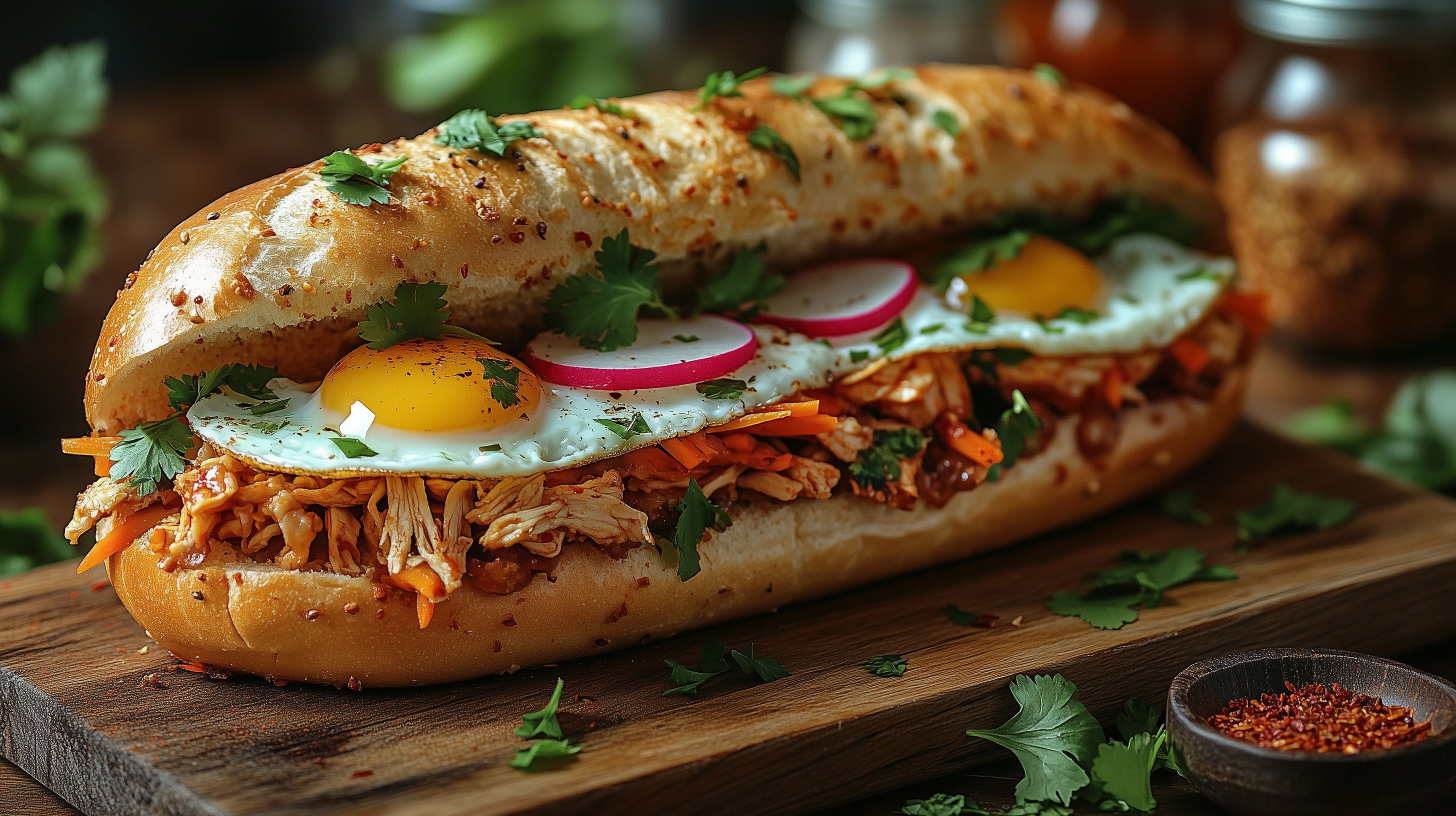 Dieses appetitanregende Foto zeigt ein frisch zubereitetes Banh Mi-Sandwich, einen beliebten vietnamesischen Streetfood-Klassiker. Das Sandwich ist auf einem rustikalen Holzbrett angerichtet und besticht durch seine Fülle an knackigem Gemüse, würziger Fleischfüllung und einem leckeren Spiegelei. Die sorgfältig arrangierten Zutaten wie Radieschen, Korianderblätter und die leicht geröstete Brotoberfläche verleihen dem Gericht einen authentischen, appetitlichen Look. Dieses hochwertige Stockfoto eignet sich hervorragend für den Einsatz in Blogs, Newslettern, Social-Media-Beiträgen oder Werbematerialien rund um das Thema Kulinarik und internationale Küche. Das Foto ist in hoher Auflösung und unter einer Creative-Commons-Lizenz verfügbar.