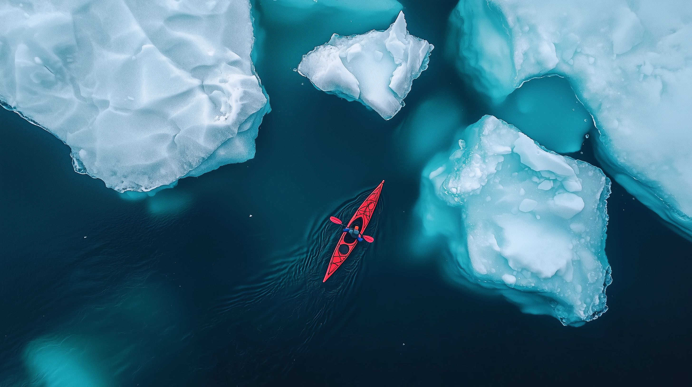 Das Bild zeigt einen Kajakfahrer, der inmitten einer faszinierenden arktischen Eislandschaft navigiert. Blaugrüne, schneebedeckte Eisberge ragen majestätisch aus dem dunkelblauen Gewässer empor, während der rote Kajak des Paddlers in der Mitte des Bildes eine starke Akzentfarbe setzt. Die Perspektive aus der Vogelperspektive verleiht dem Foto eine beeindruckende Tiefe und Weite, die den Betrachter in eine mystische, winterliche Welt entführt. Dieses hochauflösende Stockfoto ist unter Creative-Commons-Lizenz frei verwendbar und eignet sich perfekt für Blogs, Newsletter, Social-Media-Beiträge oder Werbematerialien, bei denen eine authentische, naturnahe Ästhetik gefragt ist.