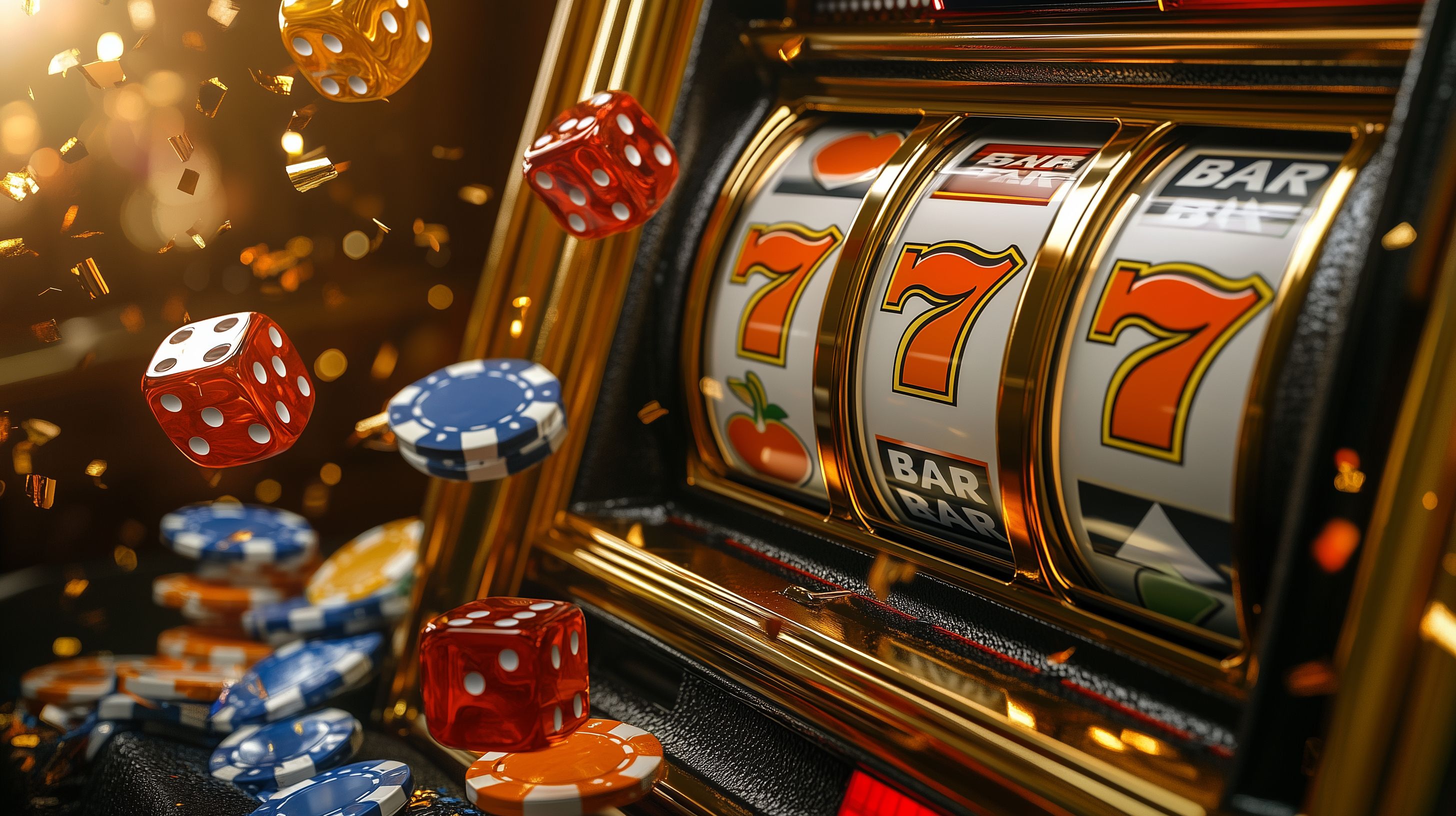 Das Bild zeigt eine Nahaufnahme einer Spielautomaten-Szene mit fallenden roten und blauen Würfeln sowie Jetons. Die Walzen des Automaten zeigen die Zahl 777, was auf einen möglichen Jackpot-Gewinn hinweist. Das Bild ist in warmen, goldenen Tönen gehalten und hat einen Bokeh-Effekt, der eine festliche, aufregende Atmosphäre vermittelt. Dieses Stockfoto eignet sich hervorragend für Werbematerialien, Blogbeiträge oder Social-Media-Posts rund um das Thema Glücksspiel, Gewinnen und das Gefühl des Erfolgs. Es ist in hoher Auflösung verfügbar und unter einer Creative-Commons-Lizenz nutzbar.