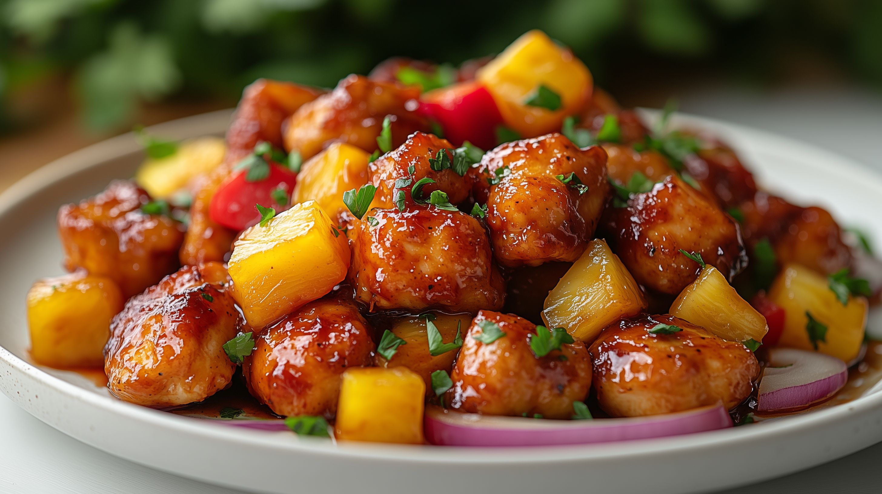 Dieses Foto zeigt ein köstliches süßsaures Hühnchengericht, serviert in einer Schüssel. Es besteht aus goldbraunen, glasierten Hähnchenspießen, gemischt mit farbenfrohen Ananasklößen, Paprikawürfeln und dekorativ geschnittenen Kräutern. Die Kombination von würzigen und fruchtigen Aromen sowie die appetitliche Präsentation machen das Gericht zu einem verlockenden Anblick. Dieses Stockfoto eignet sich hervorragend für kulinarische Blogs, Werbematerialien für Restaurants oder den Einsatz in sozialen Medien. Die hohe Auflösung und die Veröffentlichung unter einer Creative-Commons-Lizenz bieten maximale Flexibilität bei der Verwendung.