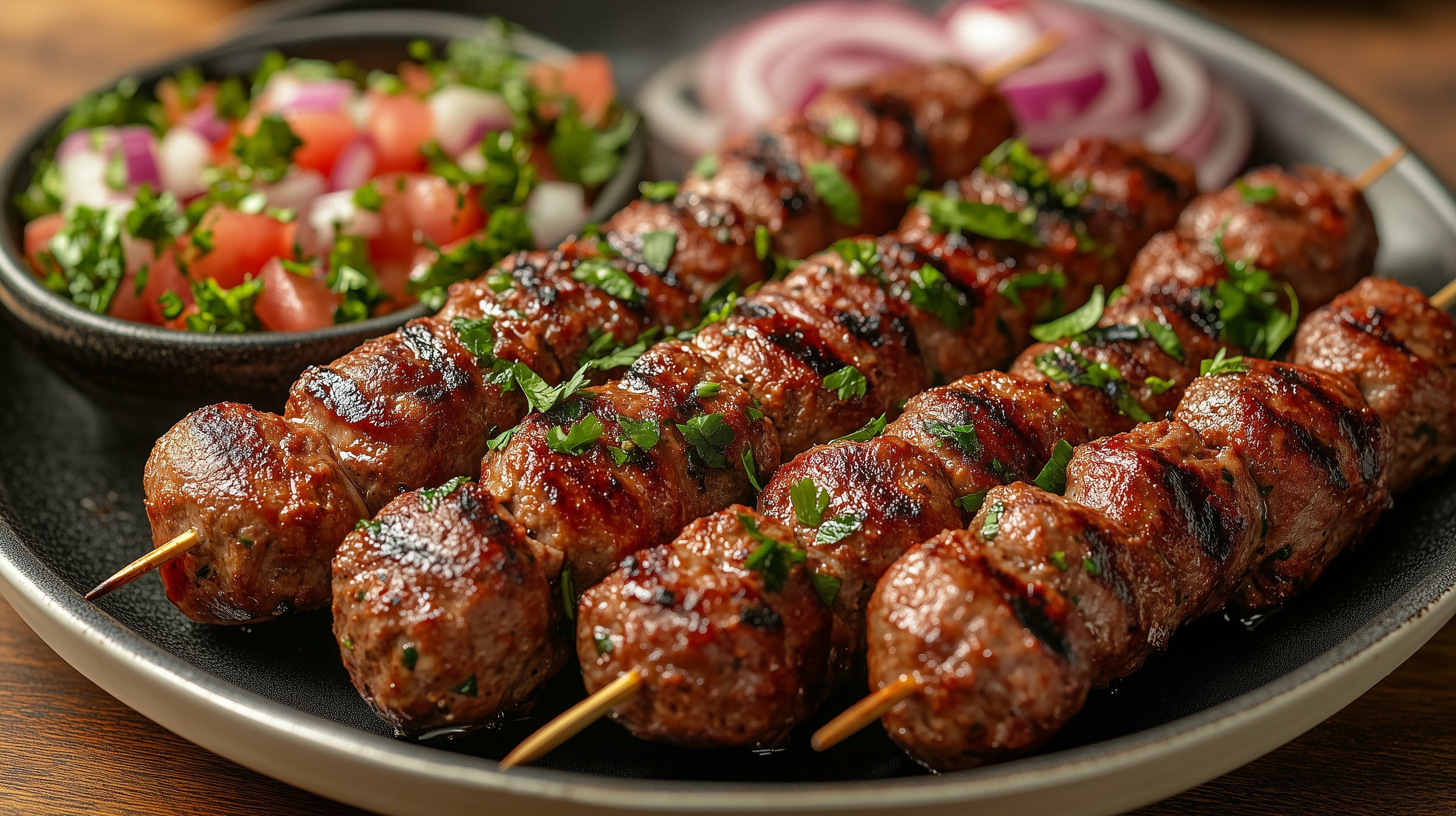 Dieses appetitliche Foto zeigt ein frisch zubereitetes Gericht aus gegrillten Köfte-Fleischspießen, serviert auf einer rustikalen Schüssel. Neben den leckeren Köfte ist auch ein knackiger Tomatensalat sowie Rotkohlsalat zu sehen, die das Gericht ergänzen. Die Zubereitung ist typisch für die Mittelmeerküche und verleiht dem Gericht einen authentischen, kulinarischen Charakter. Das Foto bietet eine hochwertige Aufnahme in hoher Auflösung, die sich ideal für verschiedene Zwecke wie Rezeptblogbeiträge, Gastronomie-Werbung oder Menü-Illustrationen eignet. Das Bild steht unter einer Creative-Commons-Lizenz kostenfrei zur Verfügung.