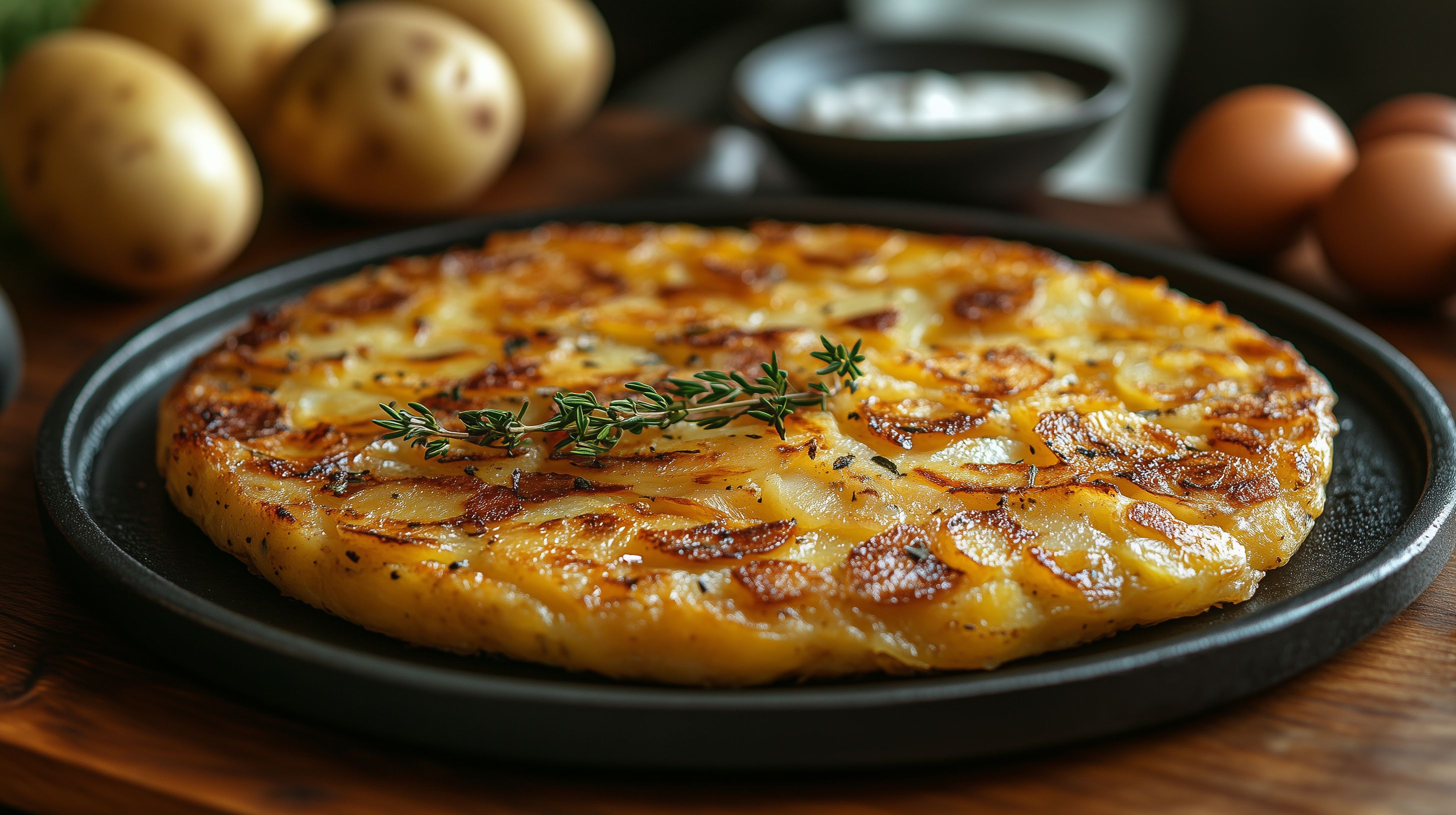 Dieses köstliche Foto zeigt eine frisch zubereitete Spanische Tortilla, eine traditionelle Eierspeise aus der spanischen Küche. Die goldbraune Oberfläche der Tortilla ist mit knusprigen, in Olivenöl gebratenen Kartoffelscheiben bedeckt und mit aromatischen Thymianblättern garniert. Das Gericht wird typischerweise in Scheiben serviert und eignet sich hervorragend als Vorspeise, Hauptgericht oder Snack. Dieses hochwertige Stockfoto in hoher Auflösung bietet vielfältige Einsatzmöglichkeiten, zum Beispiel für Foodblogs, Kochrezepte, Werbung für spanische Lebensmittel oder kulinarische Social-Media-Kanäle. Das Bild vermittelt eine authentische, rustikale Atmosphäre und ist unter der Creative-Commons-Lizenz kostenfrei nutzbar.